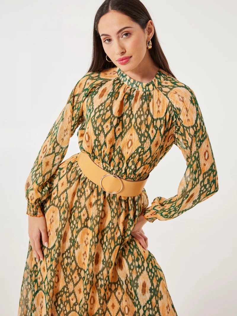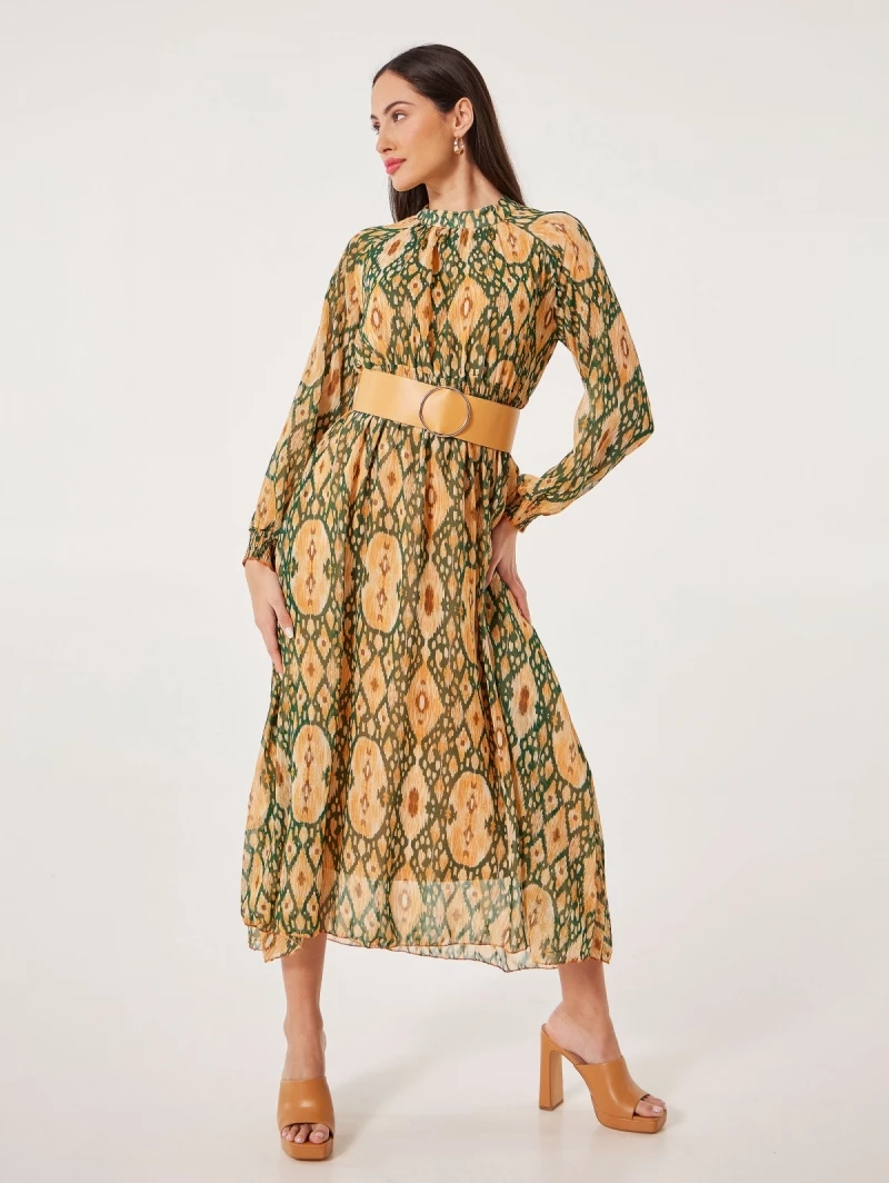Το φθηνότερο 🔥 Noobass Εμπριμέ φόρεμα με ζώνη – Κάμελ 👍