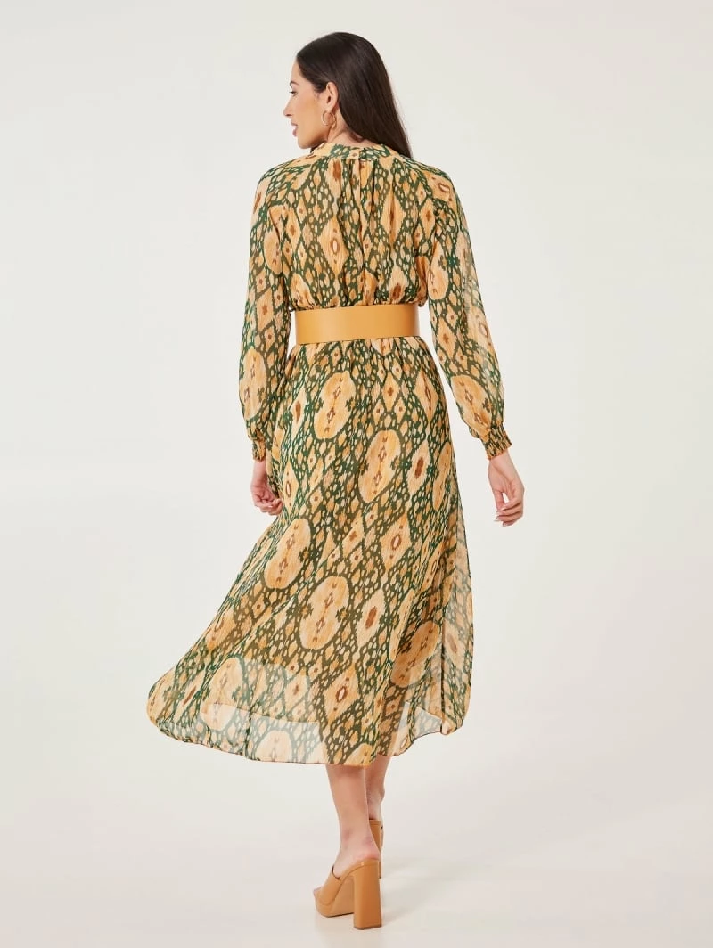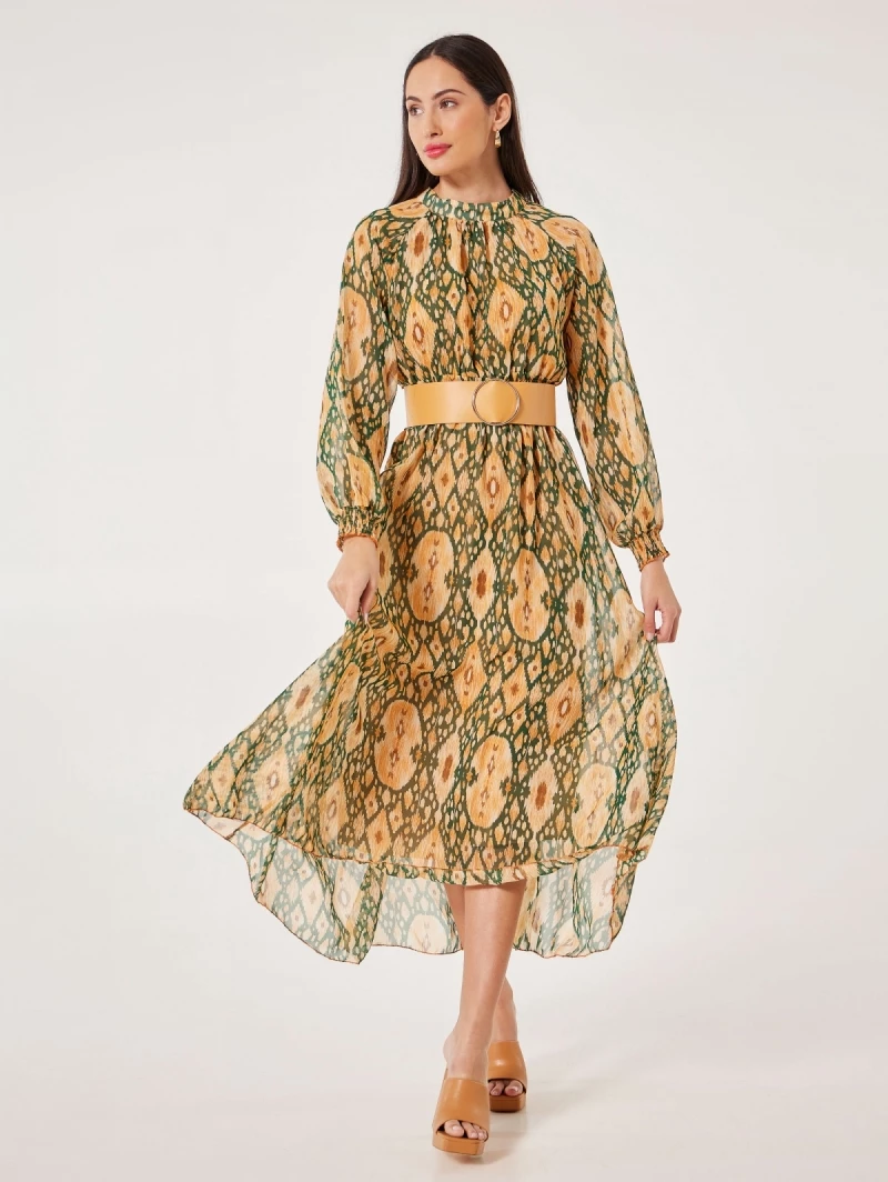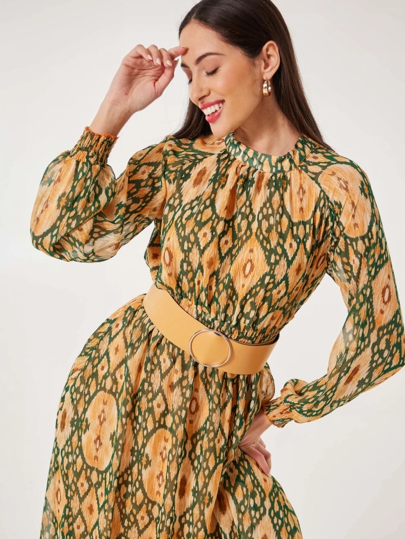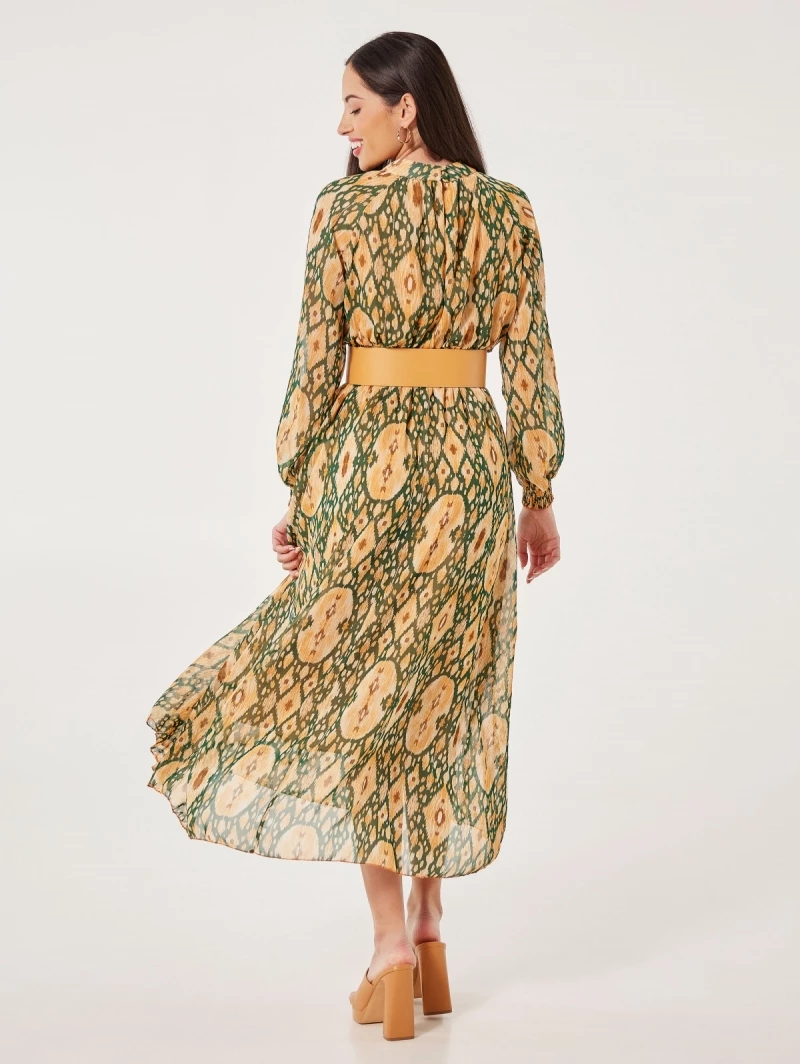 Φόρεμα maxi με εμπριμέ σχέδιο και διχρωμία.Έχει μακριά μανίκια διαφάνεια με λάστιχο στο τελείωμα..Στρογγυλή λαιμόκοψη.Άνετη γραμμή.Έχεει μικρό άνοιγμα στην πλάτη και κλείνει με κουμπιά.Περιλαμβάνεται φαρδιά ζώνη δερματίνη με στρογγυλή αγκράφα.