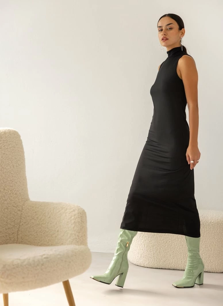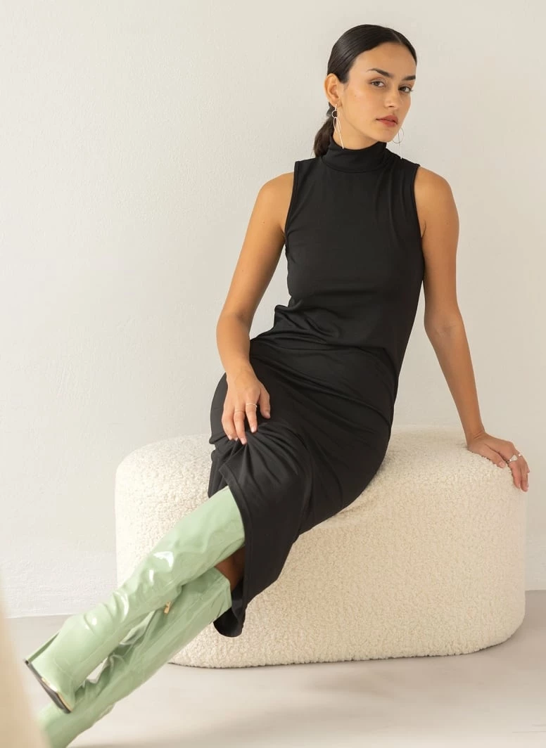 Φόρεμα casual αμάνικο σε μίντι μάκρος. Έχει ψηλή λαιμόκοψη. Ίσια γραμμή.
