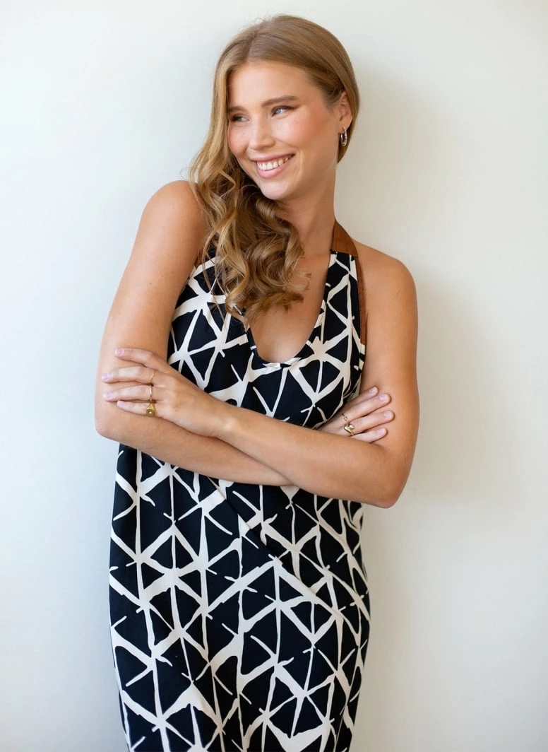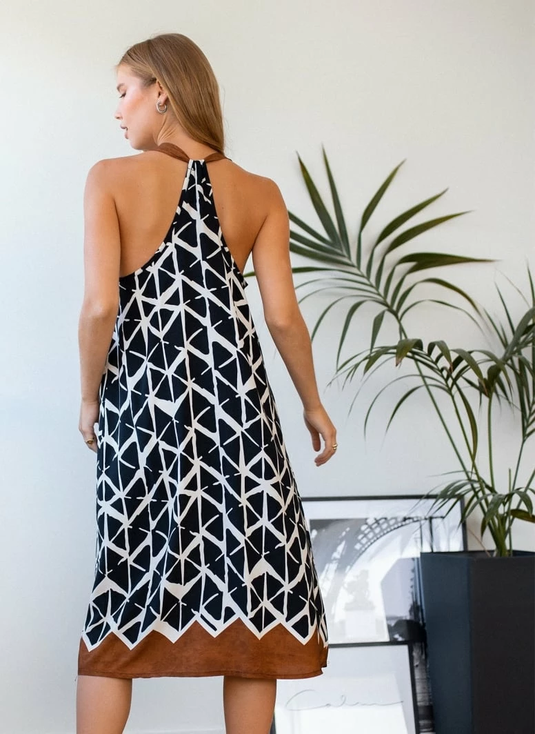 Φόρεμα αμάνικο με έντονο pattern. Έχει φάσα μονόχρωμη στο τελείωμα. Αθλητική πλάτη. Made in Italy