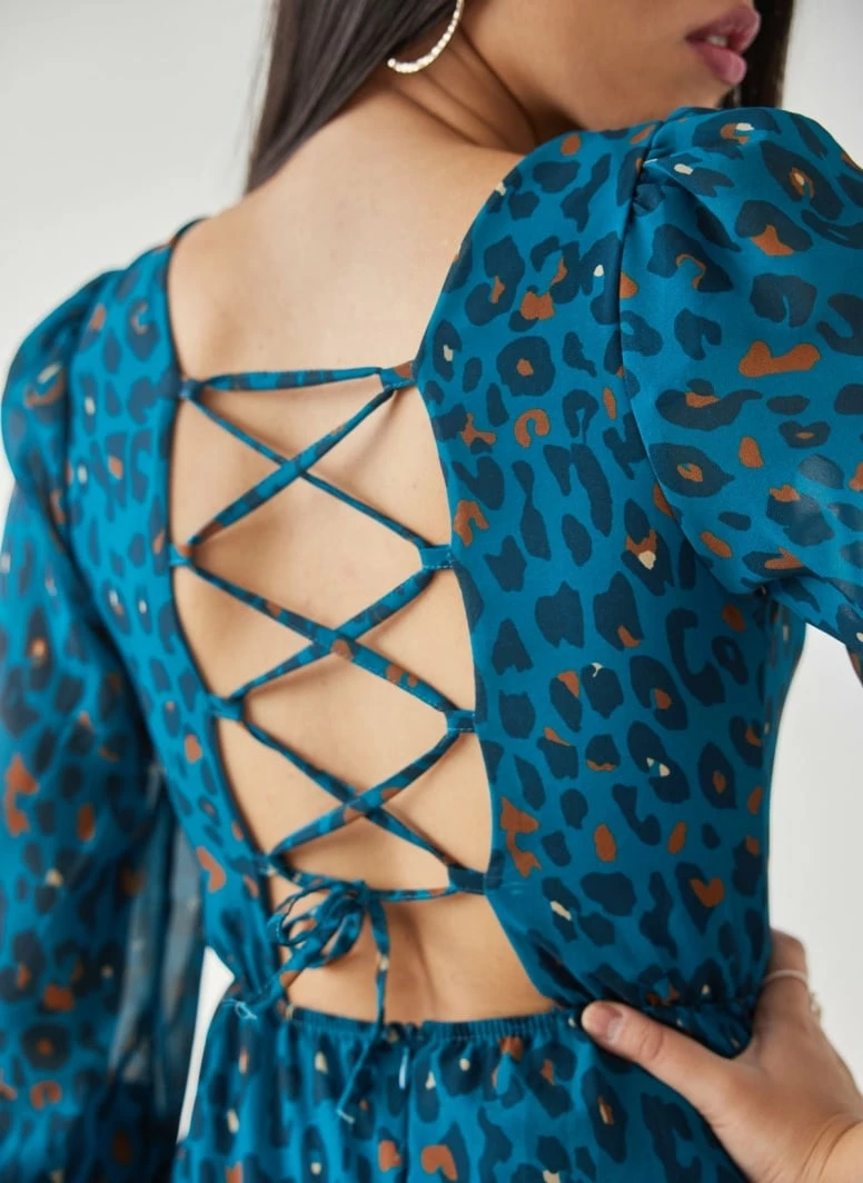 Φόρεμα μακρυμάνικο με print. Έχει σταθερή ενίσχυση στο μπούστο. Ανοιχτή πλάτη με χιαστί κορδόνια. Κλείνει με φερμουάρ στο πίσω μέρος.