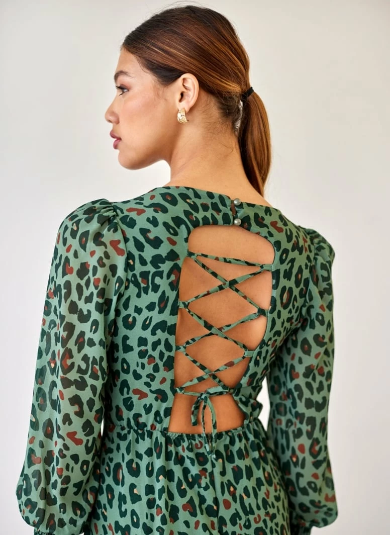 Φόρεμα μακρυμάνικο με print. Έχει σταθερή ενίσχυση στο μπούστο. Ανοιχτή πλάτη με χιαστί κορδόνια. Κλείνει με φερμουάρ στο πίσω μέρος.