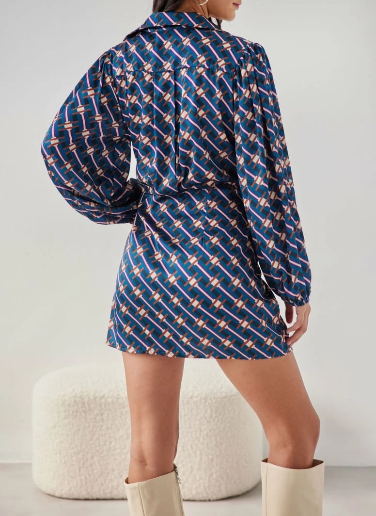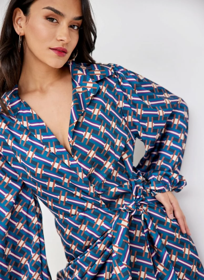 Φόρεμα σατέν με γεωμετρικά σχέδια. Έχει σχέδιο κρουαζέ με κόμπο. V cut άνοιγμα με γιακά. Λάστιχο στα μανίκια.
