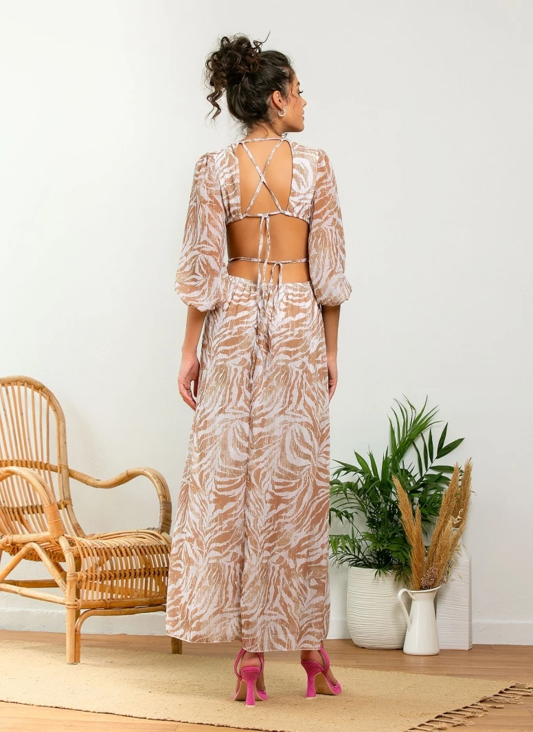 Φόρεμα διαφάνεια με διπλό ύφασμα.Έχει cut outs στη μέση και ανοιχτή πλάτη με κορδόνια.Τα μανίκια έχουν λάστιχο στο τελείωμα. Στρογγυλή λαιμόκοψη. Made in Italy.