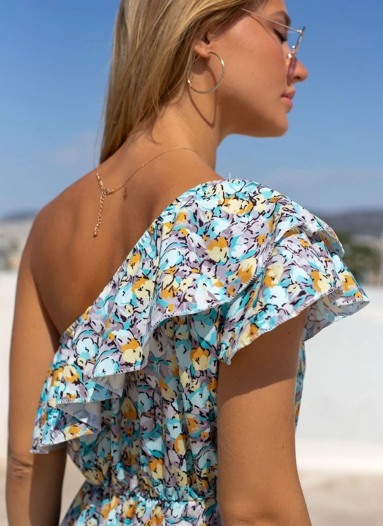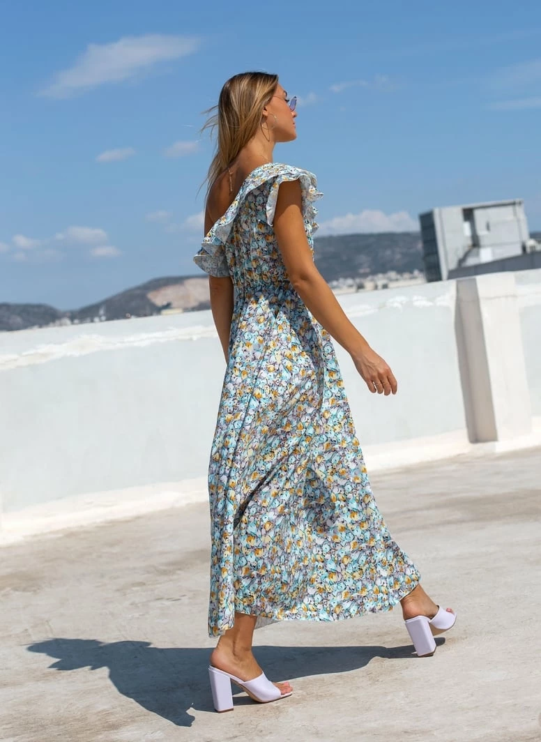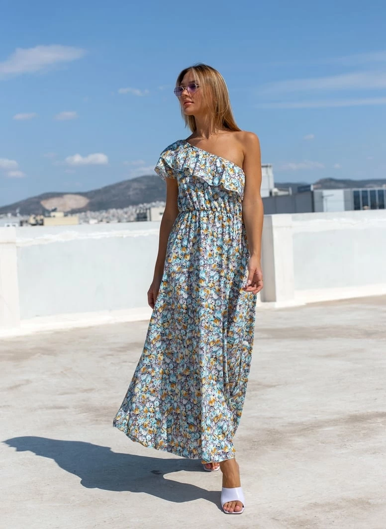 Maxi φόρεμα με print. Έχει έναν ώμο και βολάν στο μπούστο. Λάστιχο στη μέση. Άνετη γραμμή. Made in Italy.