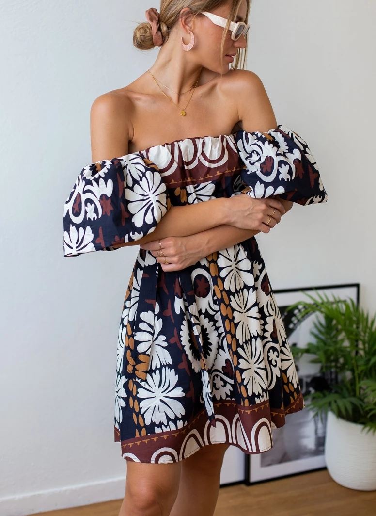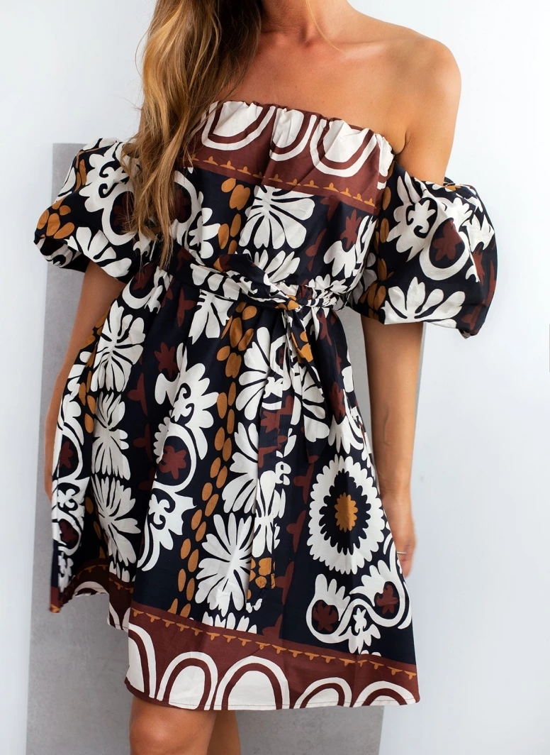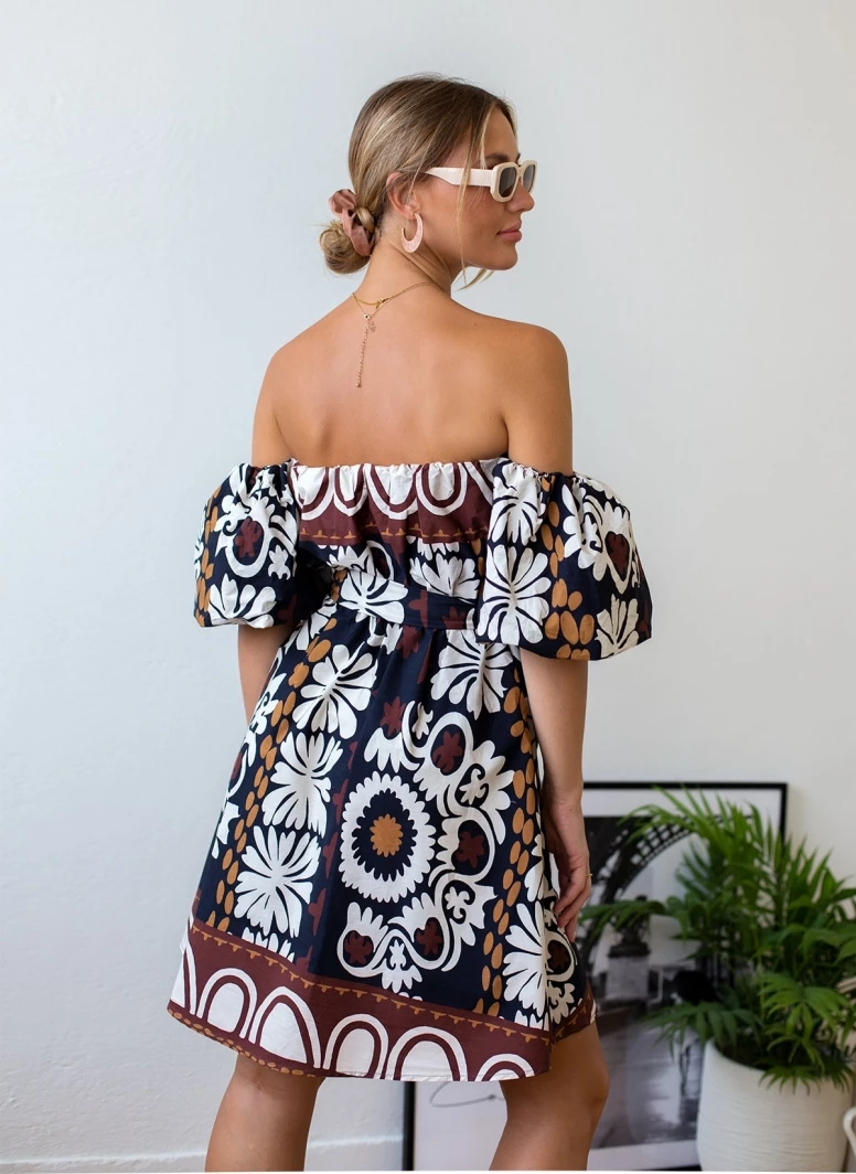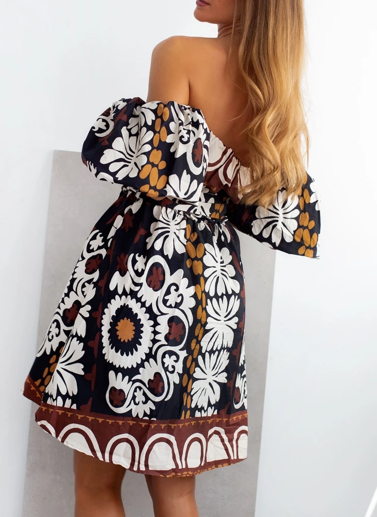 Φόρεμα μίνι με σχέδιο σε συνδυασμούς χρωμάτων. Έχει φουσκωτά μανίκια με λάστιχο. Made in Italy.