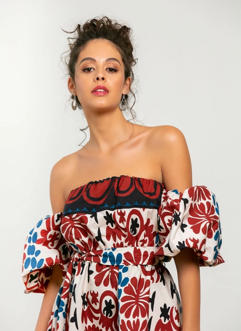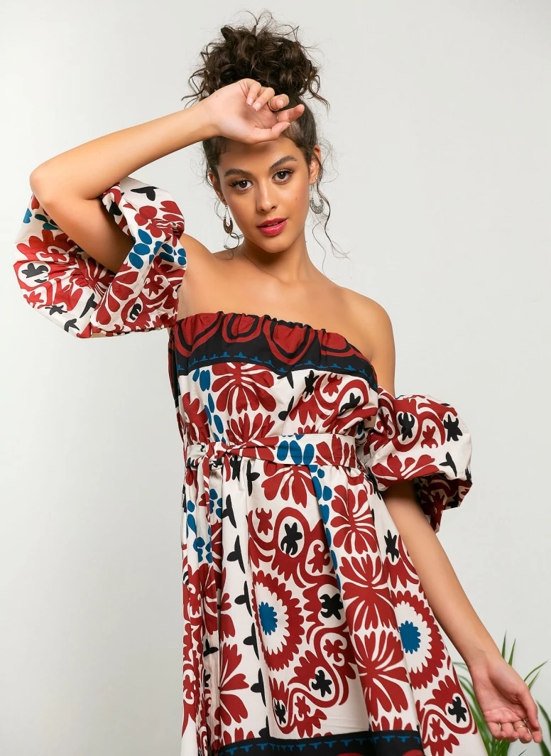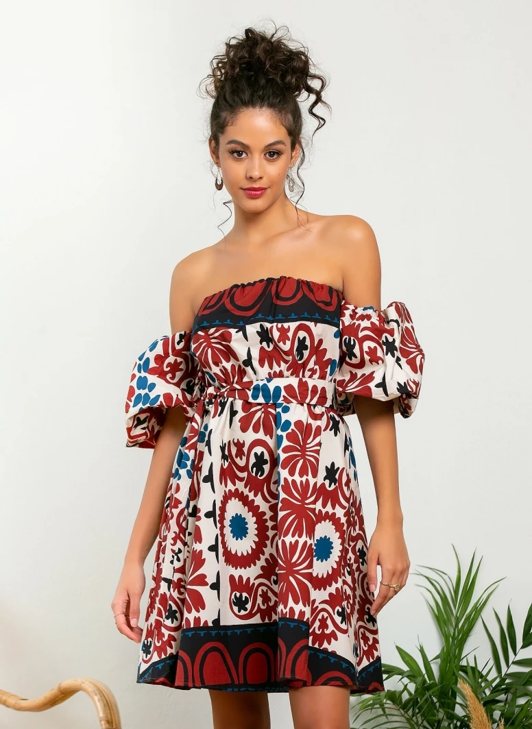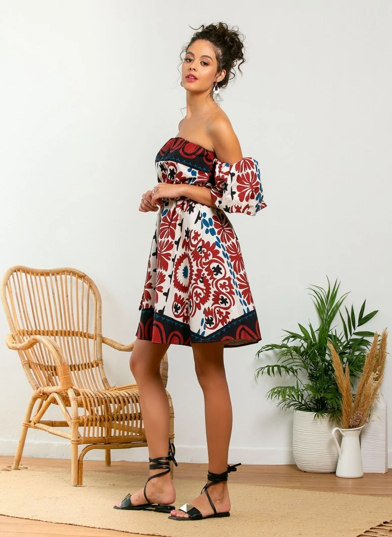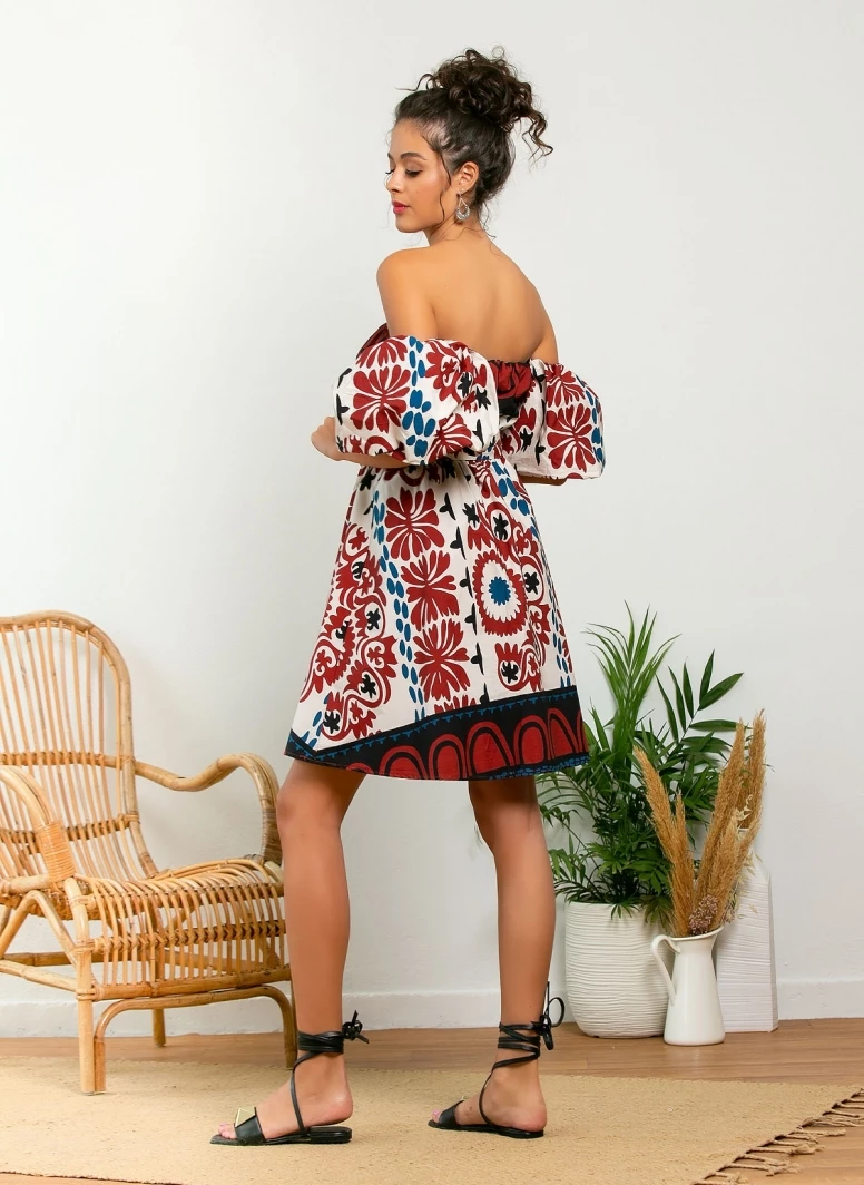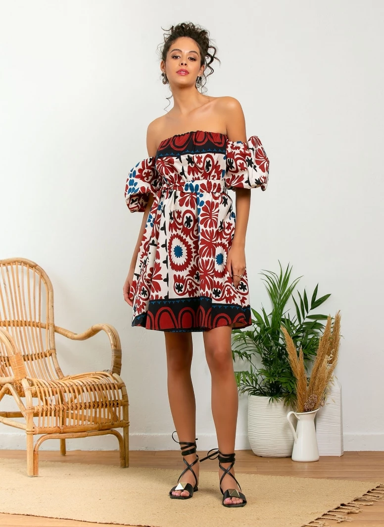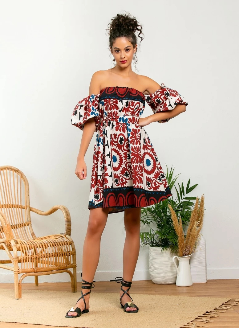 Φόρεμα μίνι με σχέδιο σε συνδυασμούς χρωμάτων. Έχει φουσκωτά μανίκια με λάστιχο. Made in Italy.