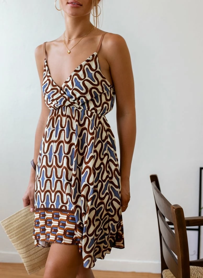 Φόρεμα με ιδιαίτερο pattern σε συνδυασμούς χρωμάτων. Έχει λεπτά ραντάκια. Κρουαζέ μπούστο.