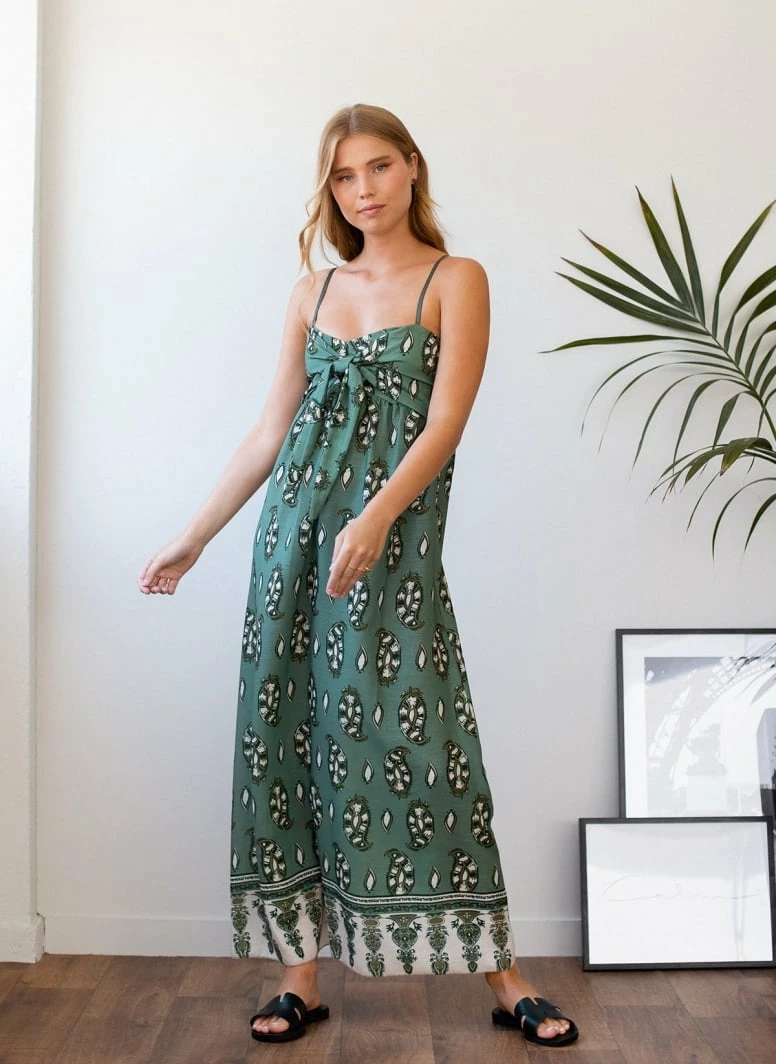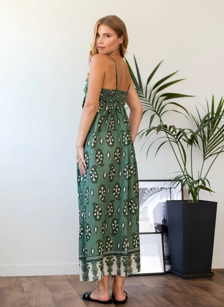 Φόρεμα maxi λινό με σχέδιο λαχούρια. Έχει δέσιμο στο μπούστο. Τα ραντάκια προσαρμόζονται. Ελαστική πλάτη.