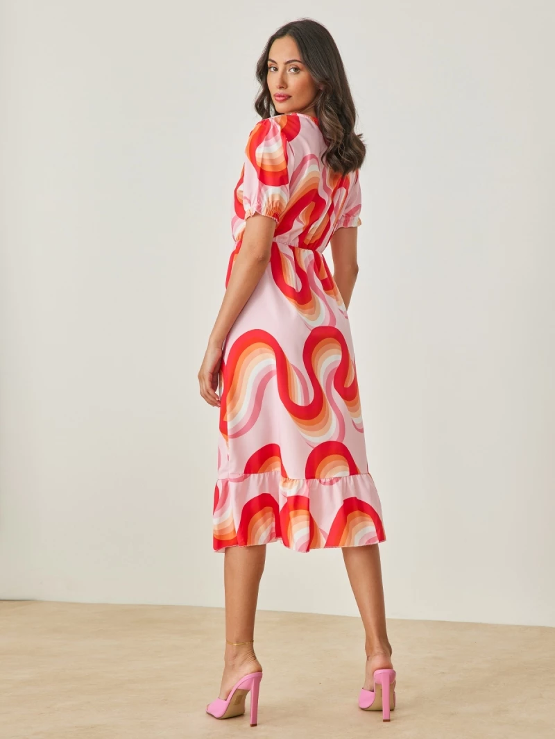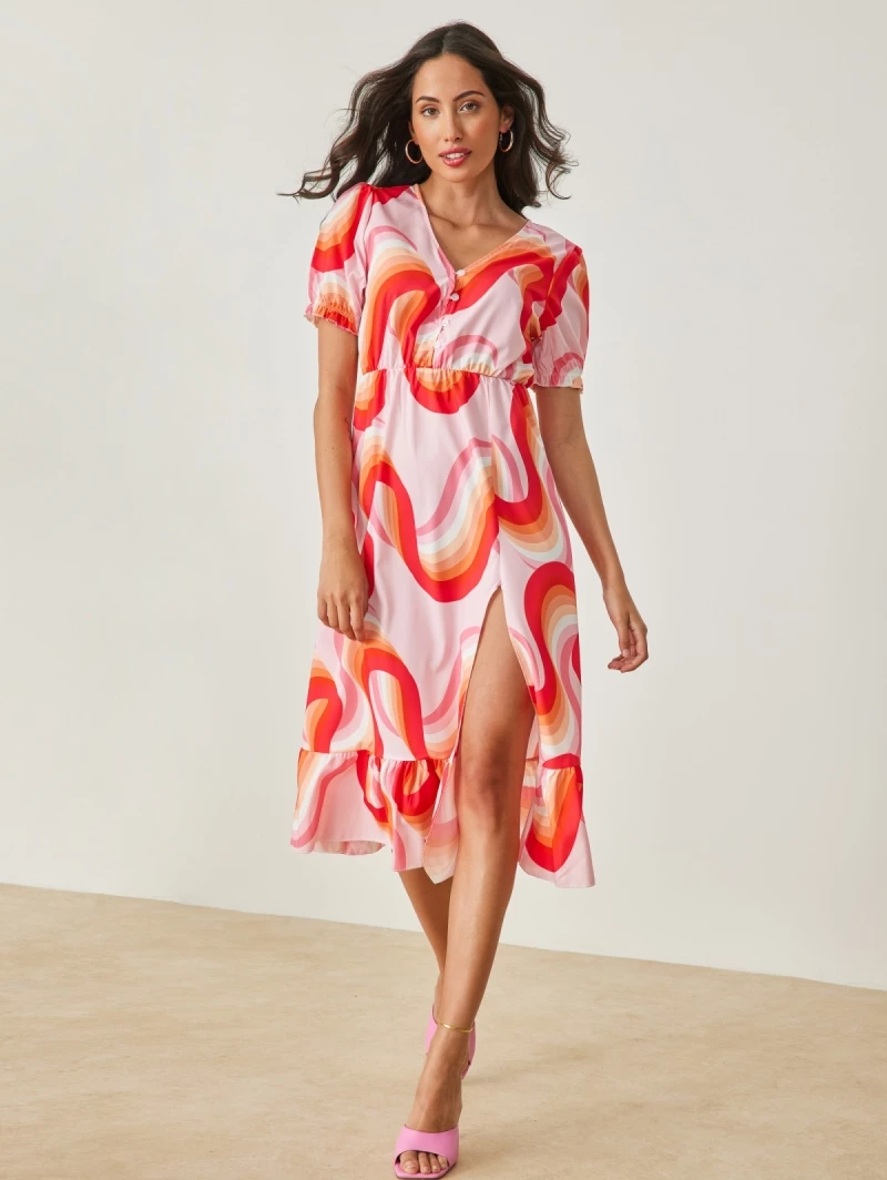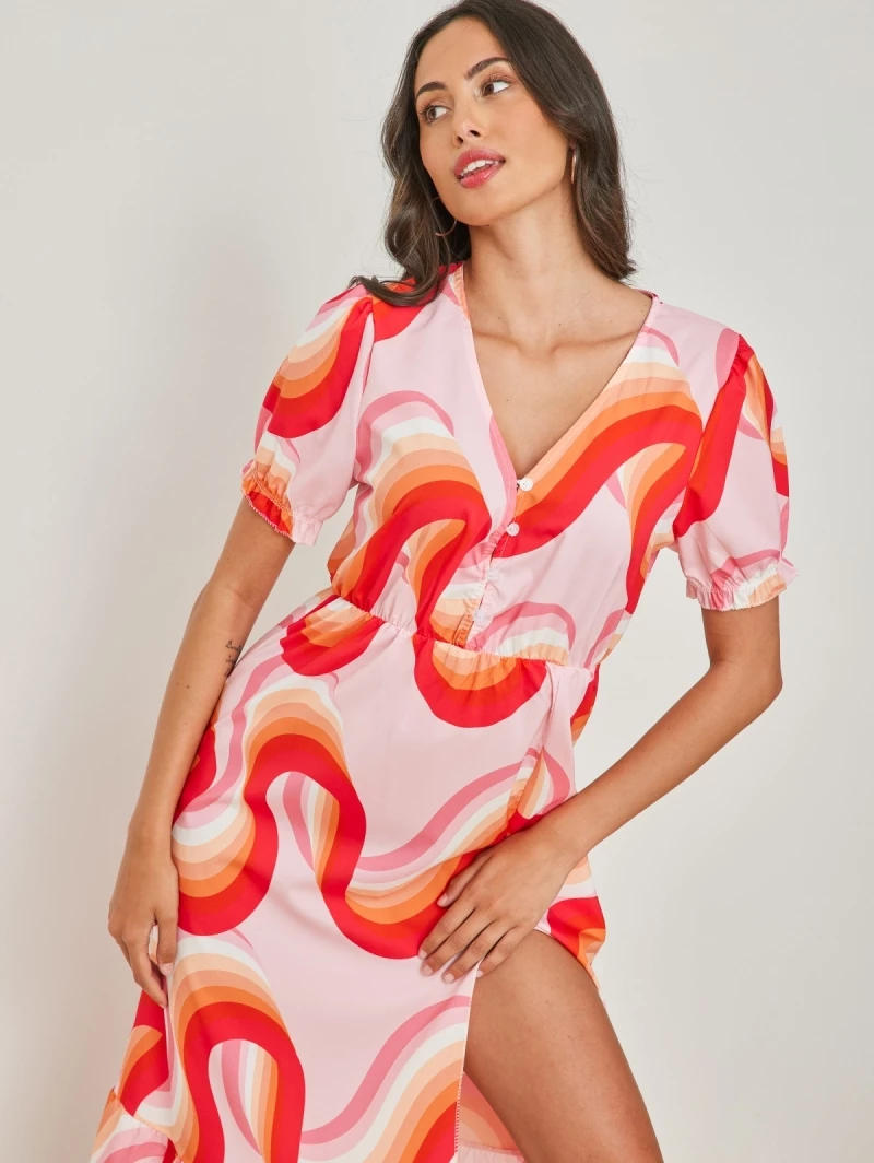 Φόρεμα μίντι με pattern. Έχει κοντά μανίκια με λάστιχο στο τελείωμα. Το μπούστο έχει v cut σχέδιο με μικρά κουμπιά. Στο πλάι έχει άνοιγμα και βολάν στο τελείωμα. Made in Italy.