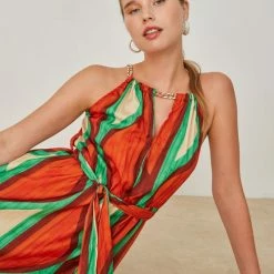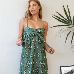Φόρεμα σατέν με λεπτά ραντάκια. Κρουαζέ μπούστο με λάστιχο στη μέση. Έχει έντονο pattern με φάσα στο τελείωμα. Άνοιγμα στη μπροστινή πλευρά.