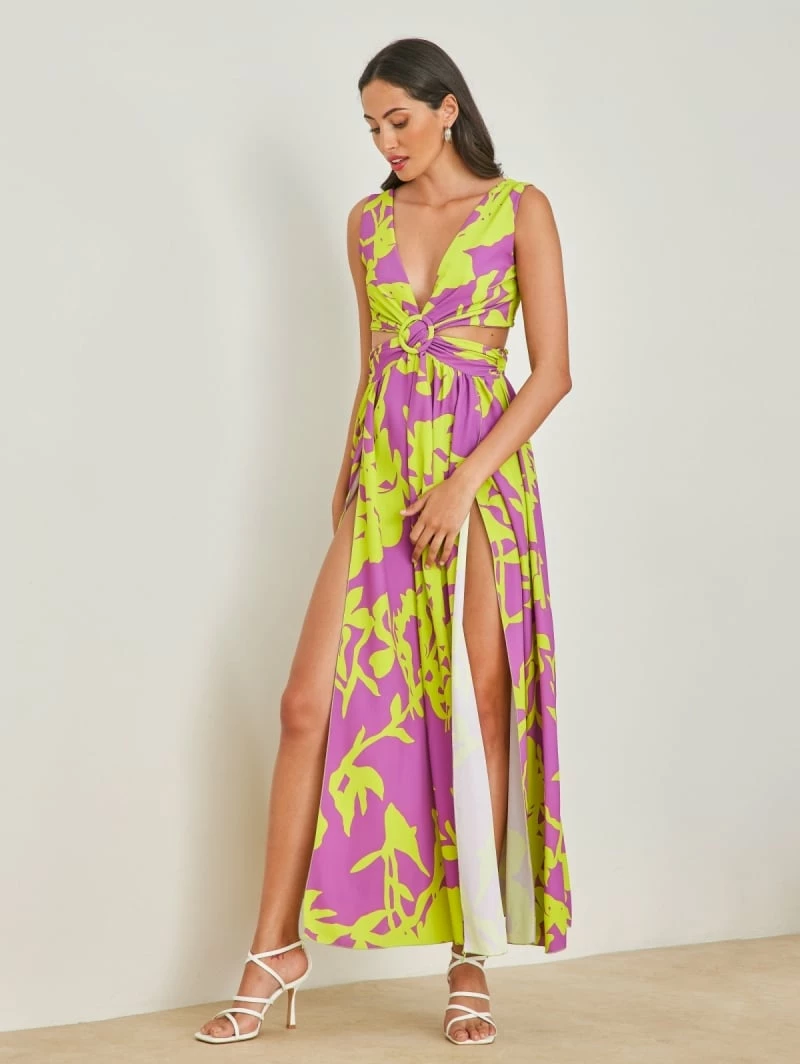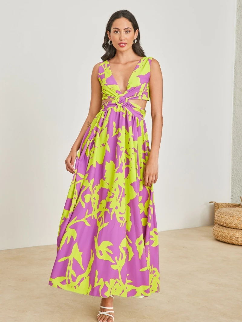 Φόρεμα μακρύ με λουλούδια. V cut λαιμόκοψη. Έχει cut outs στο πλάι και κρίκο στο ίδιο χρώμα. Δένει στην πλάτη. Έχει ανοίγματα στο πλάι. Made in Italy.
