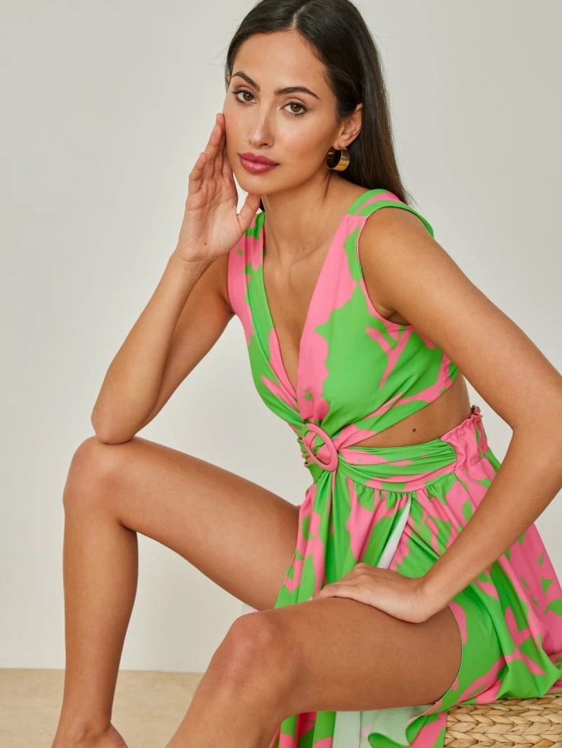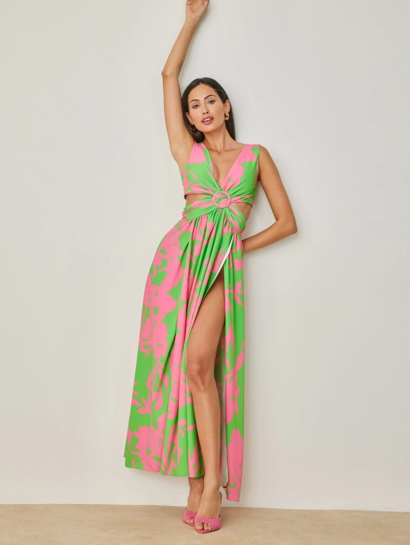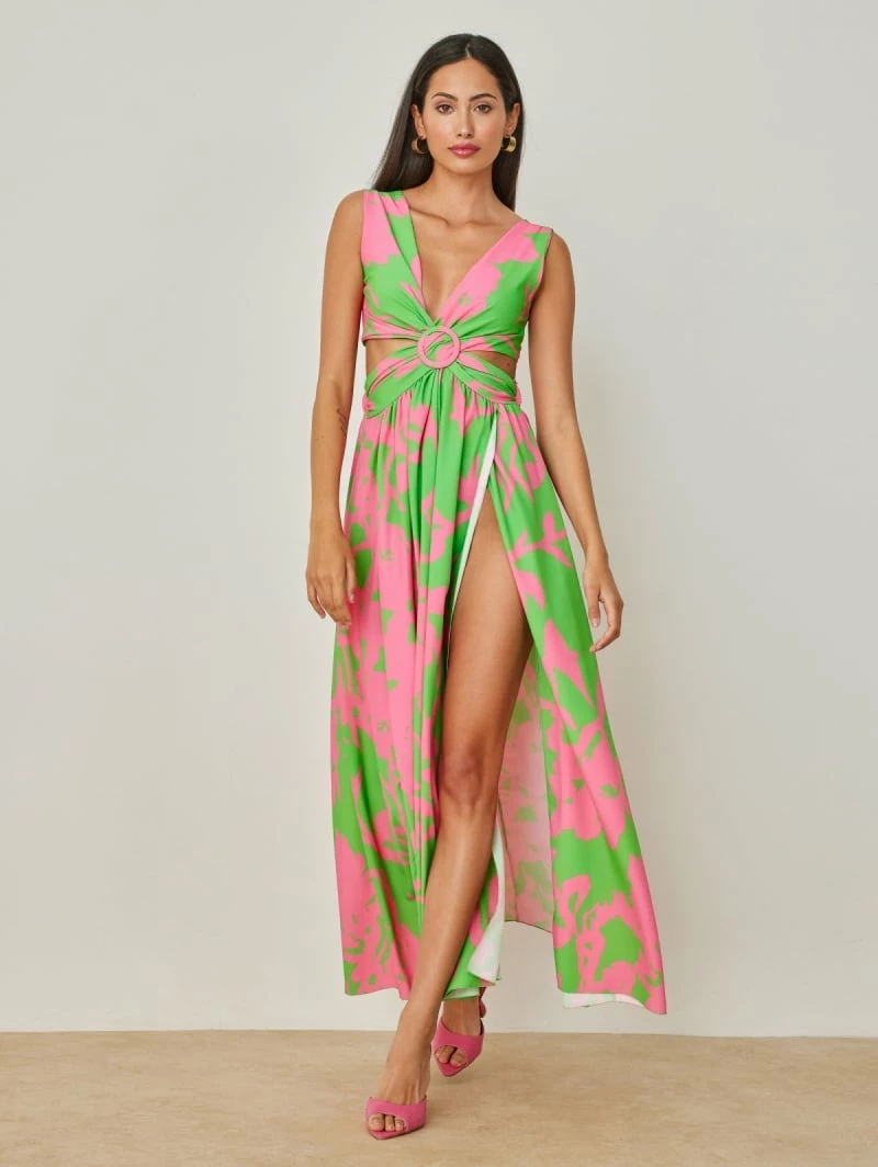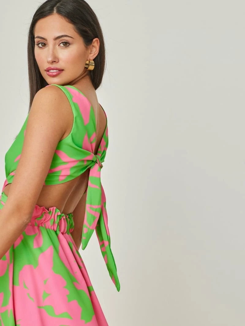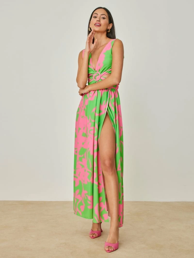 Φόρεμα μακρύ με λουλούδια. V cut λαιμόκοψη. Έχει cut outs στο πλάι και κρίκο στο ίδιο χρώμα. Δένει στην πλάτη. Έχει ανοίγματα στο πλάι. Made in Italy.