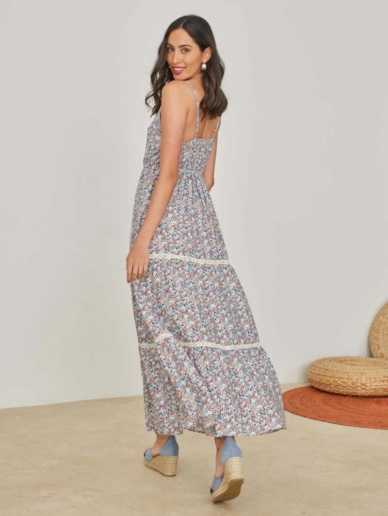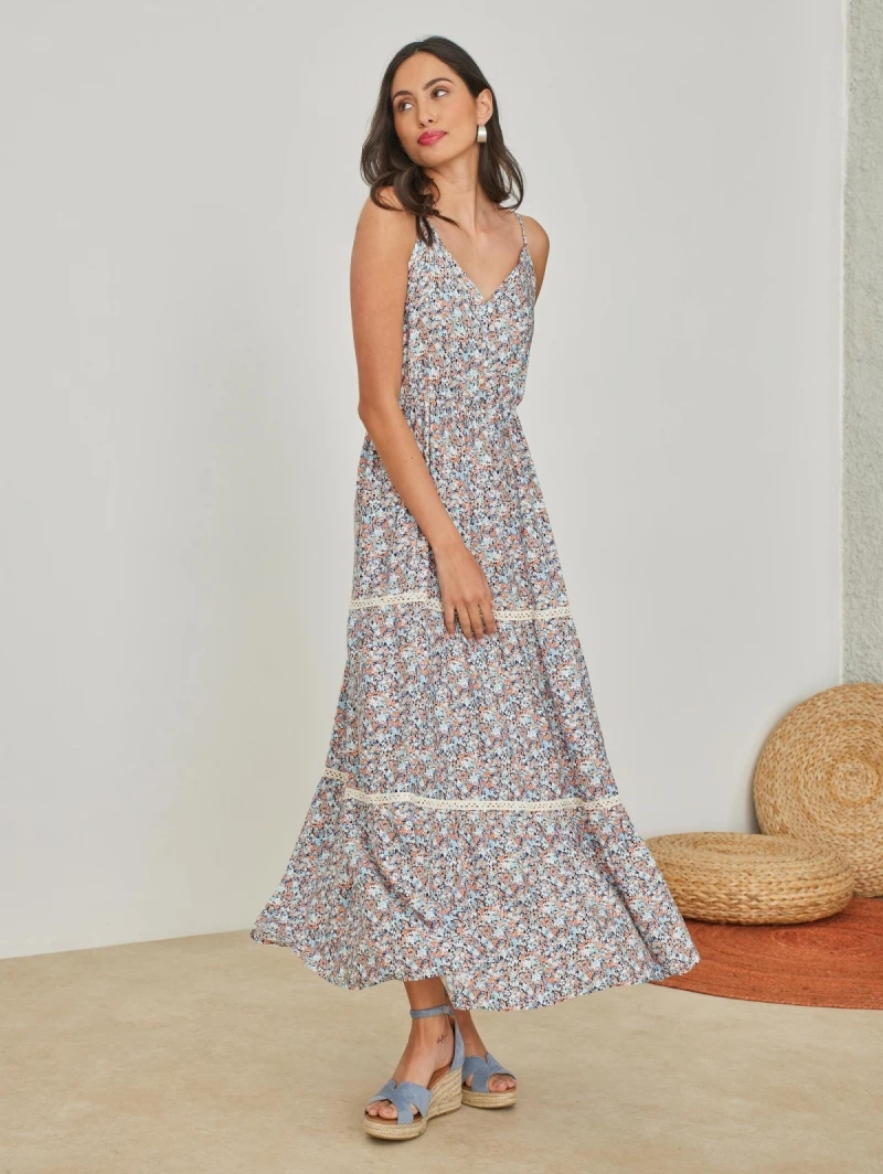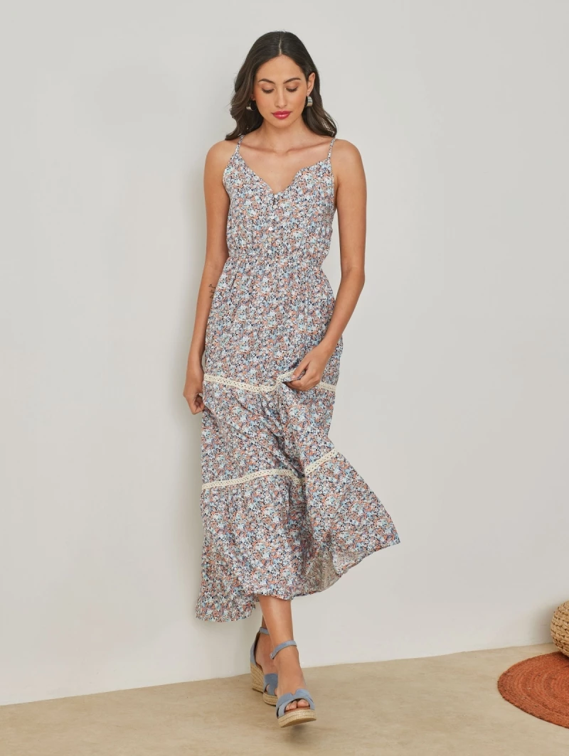 Φόρεμα φλοράλ με ρίγες από δαντέλα. Κλείνει με κουμπιά στο μπούστο. Έχει σχέδιο βολάν στο κάτω μέρος.