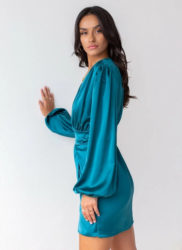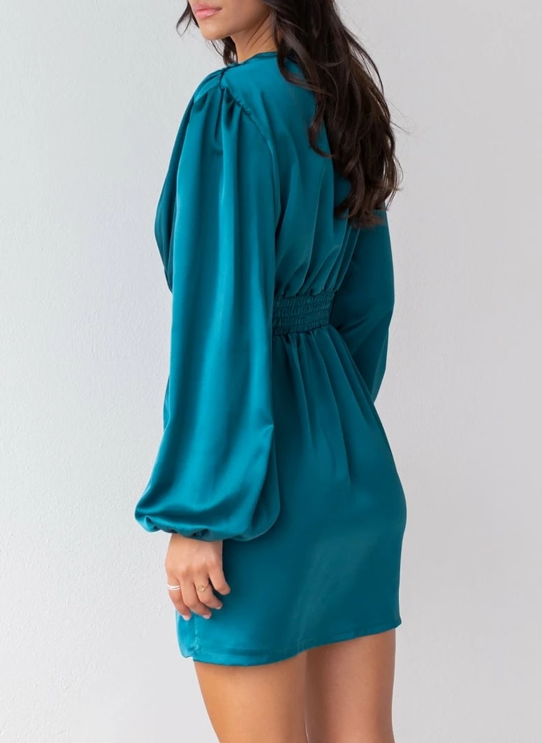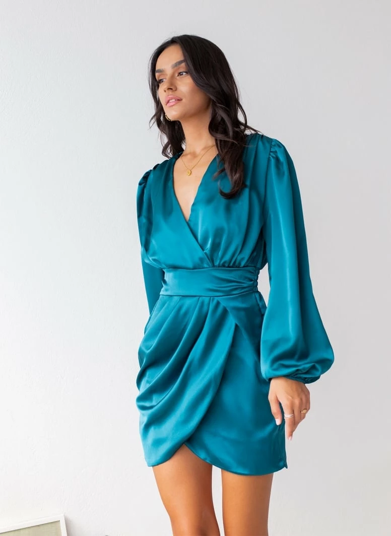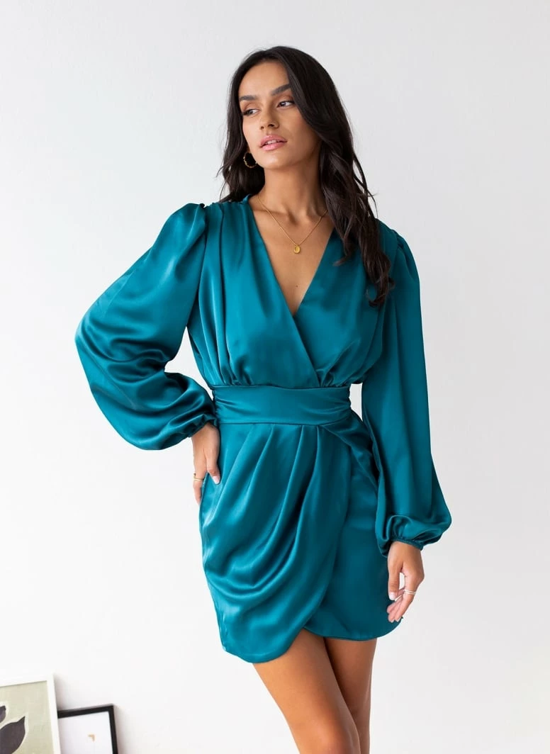 Κοντό φόρεμα σατέν με μακριά μανίκια. Διαθέτει κρουαζέ V ανοιχτή λαιμόκοψη. Έχει εφέ από μικρές σούρες στον ώμο και λάστιχο στην πίσω πλευρά της μέσης.