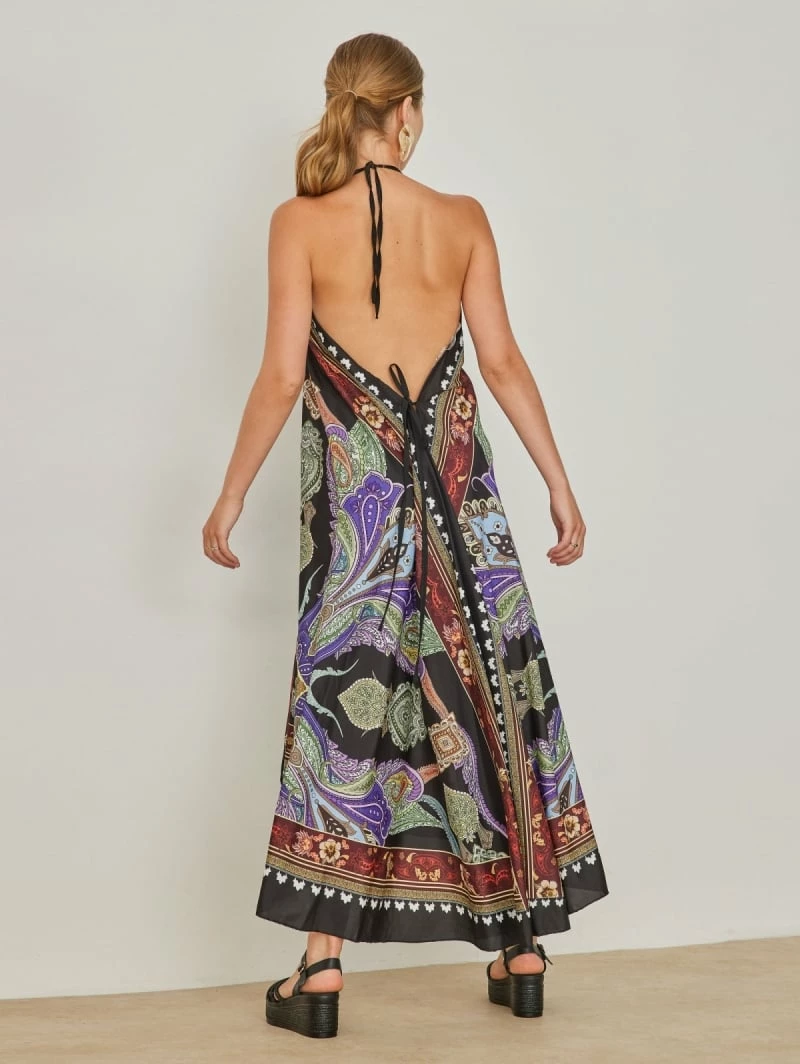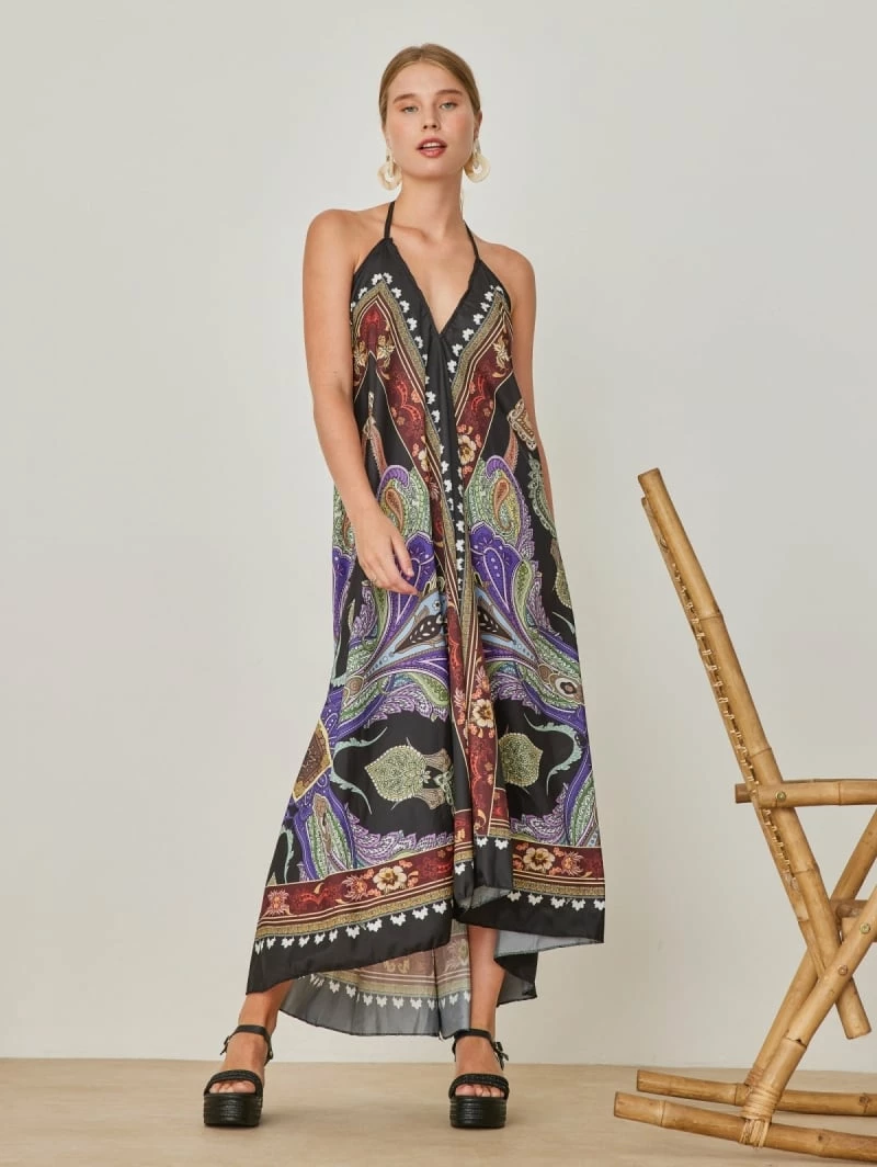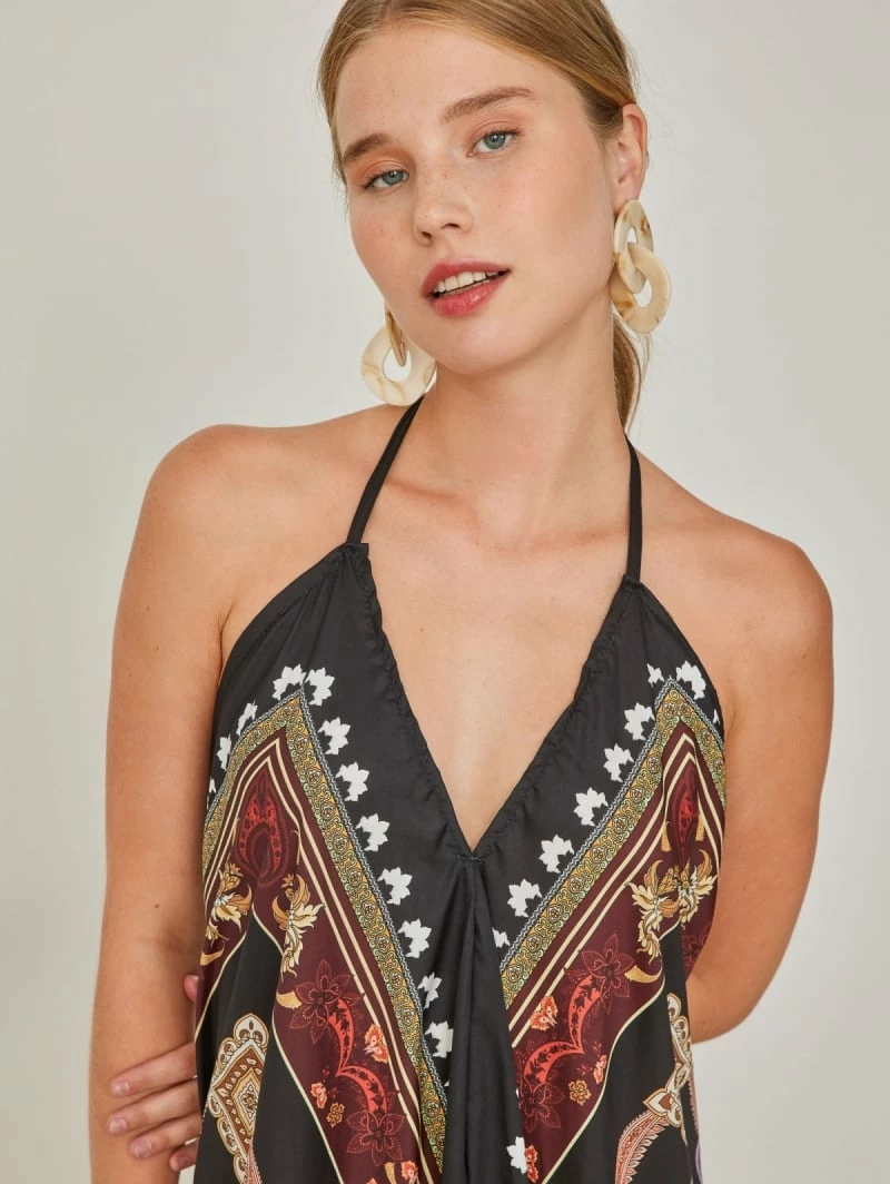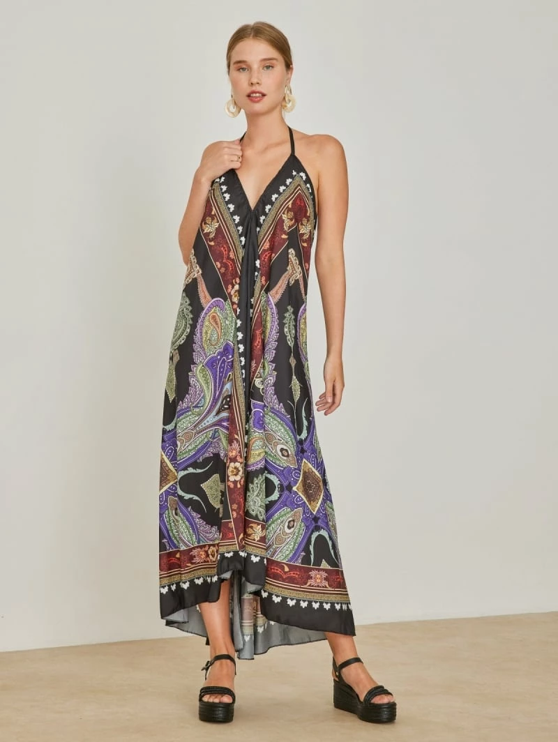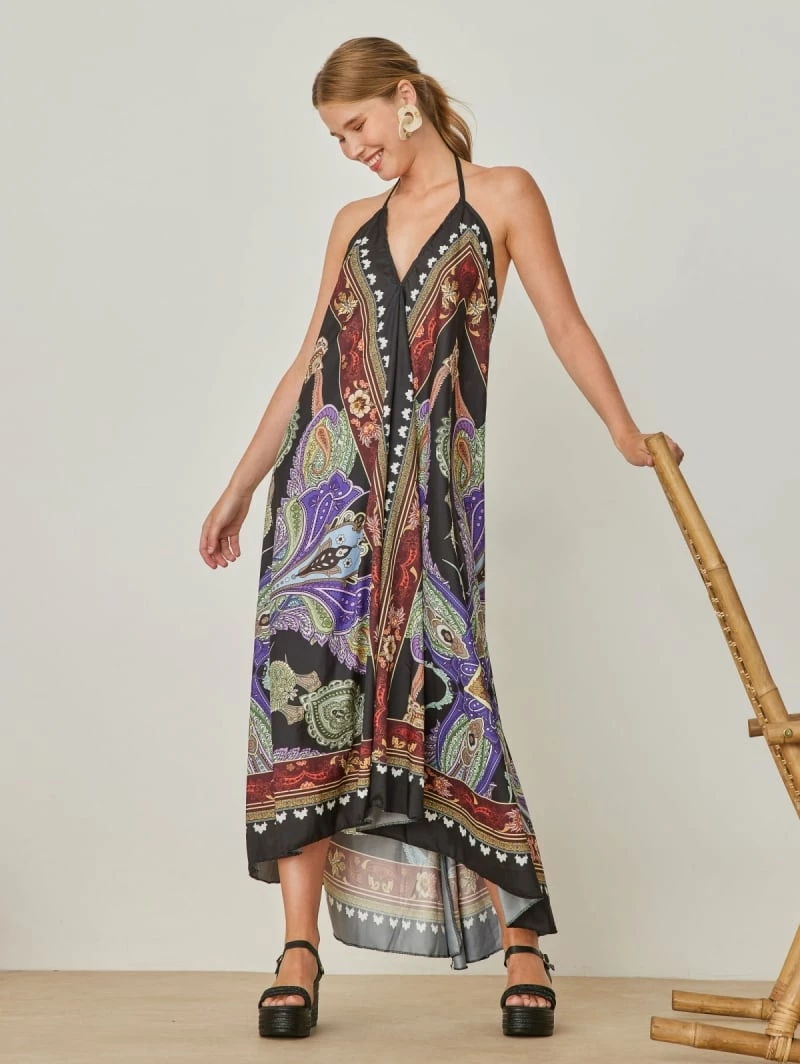 Φόρεμα ασύμμετρο με ethnic σχέδιο. Έχει κορδόνι και προσαρμόζεται στη μέση. Δένει στο λαιμό. Made in Italy.