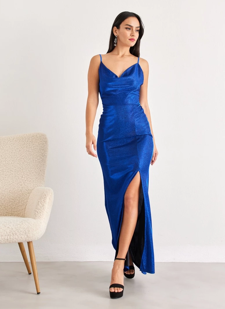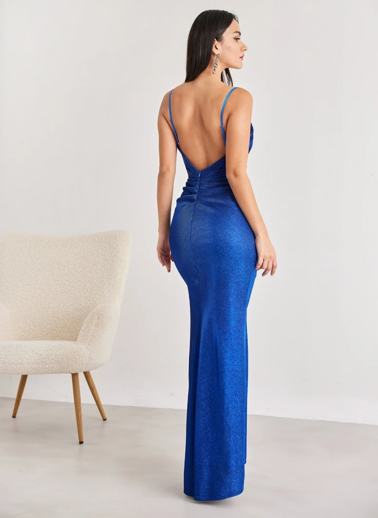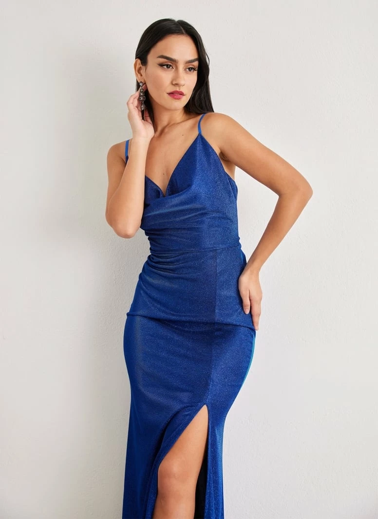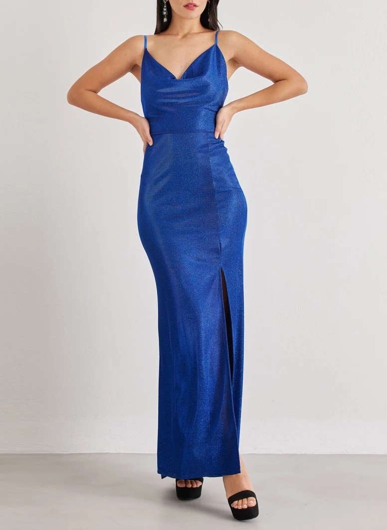 Φόρεμα μάξι με glitter ύφασμα. Έχει λεπτά ρυθμιζόμενα ραντάκια και ντραπέ σχέδιο στο μπούστο. Κλείνει με φερμουάρ στο πίσω μέρος. Άνοιγμα στο πλάι. Made in Italy.