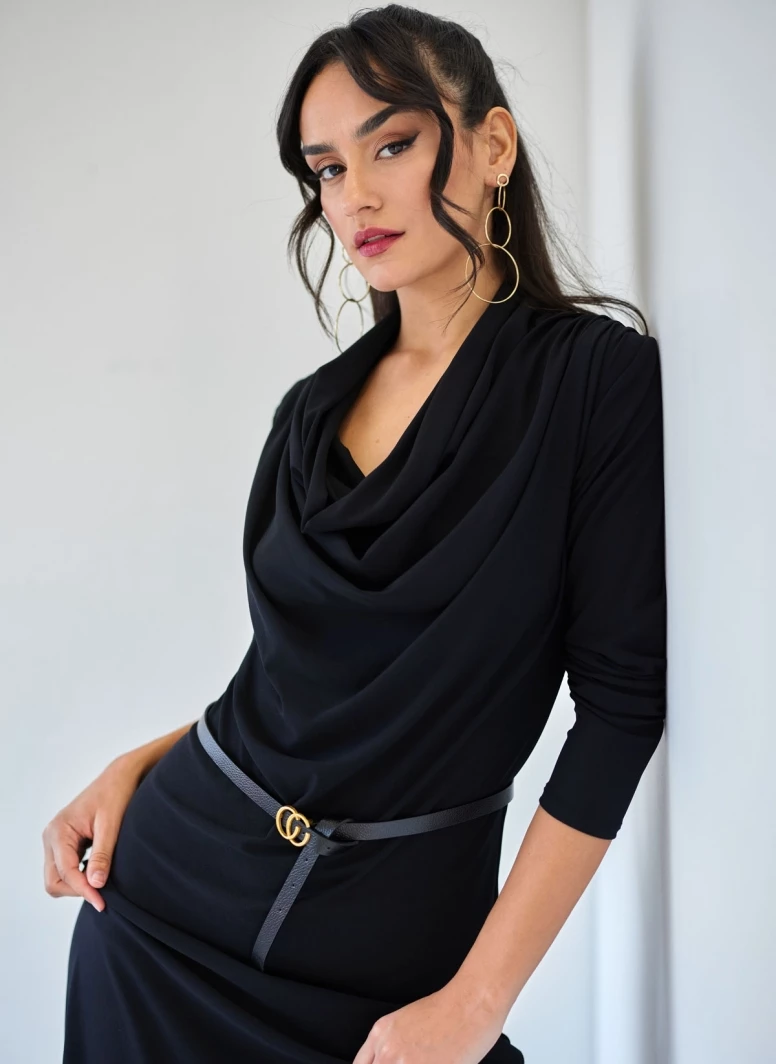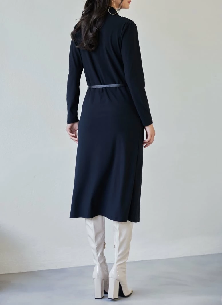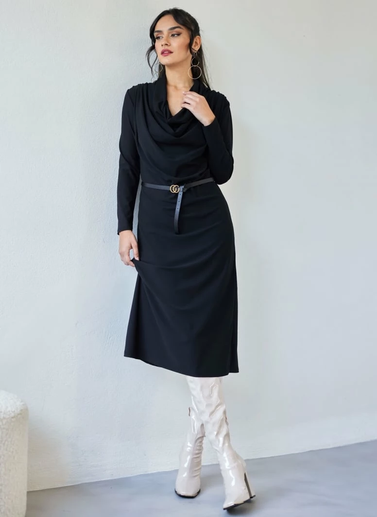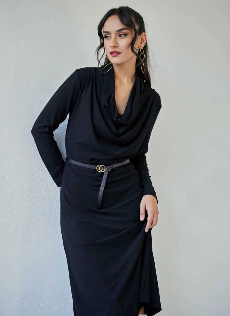 Φόρεμα μακρυμάνικο μίντι σε ίσια γραμμή.Έχει σούρες στη μπροστινή πλευρά. Περιλαμβάνεται λεπτό ζωνάκι δερματίνη.
