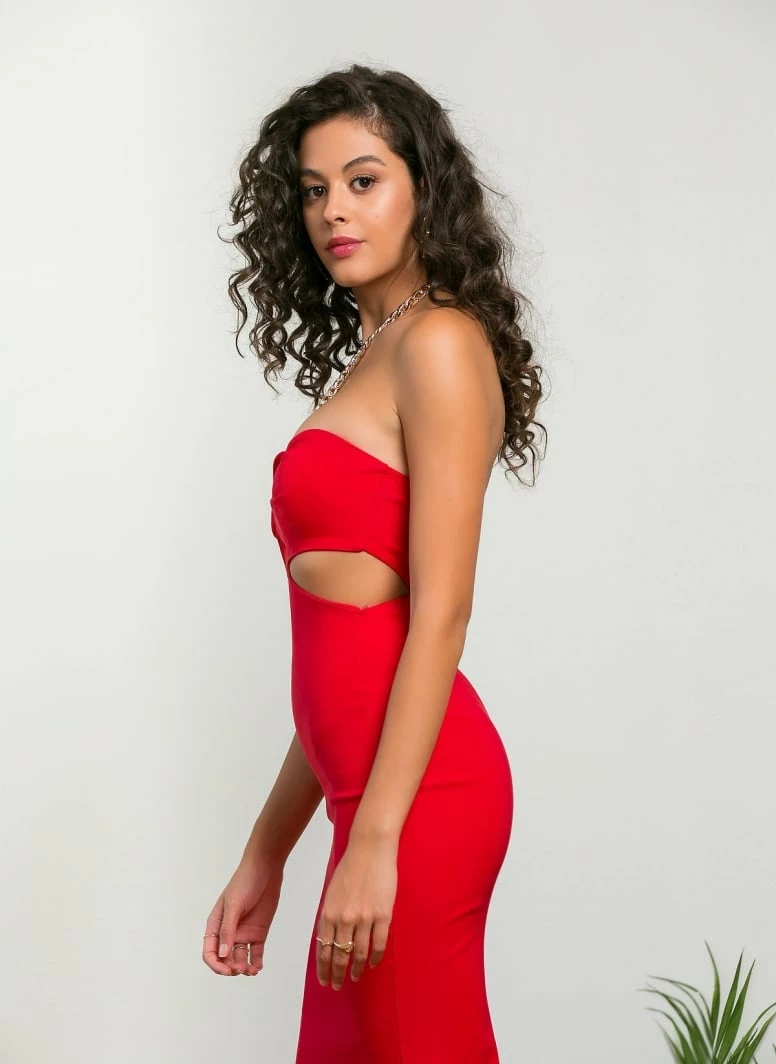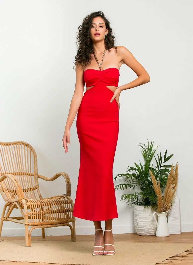 Φόρεμα midi σε εφαρμοστή γραμμή. Έχει cut outs στα πλαινά. Σταθερή ενίσχυση στο μπούστο. Περαστή αλυσίδα στο λαιμό. Made in Italy.