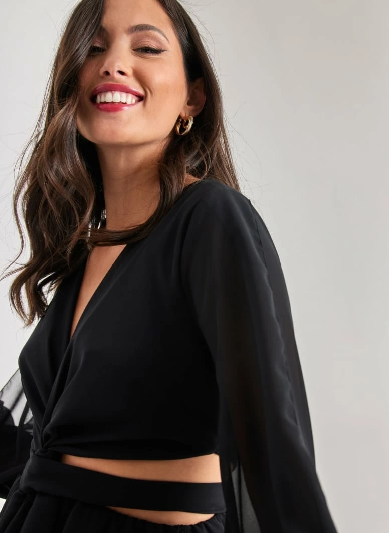 Φόρεμα μίνι με cut outs και δέσιμο στη μέση. Το μπούστο είναι κρουαζέ. Διπλό ύφασμα στο κάτω μέρος. Made in Italy.