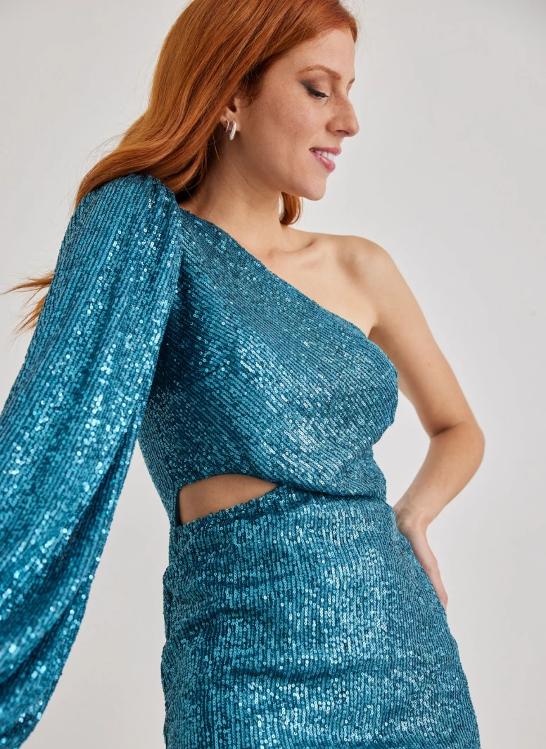 Μίνι φόρεμα με παγιέτες και ένα μανίκι. Έχει άνοιγμα στη μέση και λάστιχο. Το μανίκι είναι φαρδύ. Έχει ενσωματωμένα cups.
