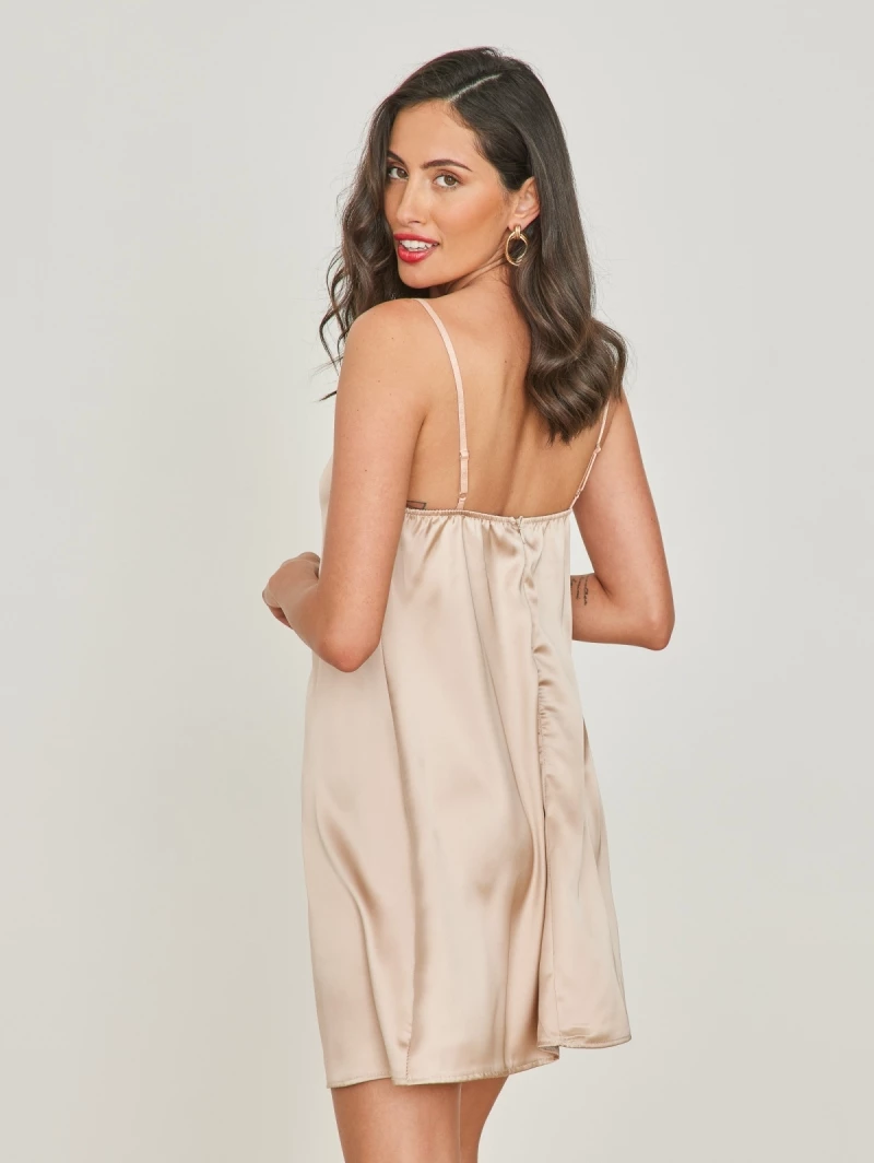 Φόρεμα μίνι σατέν με λεπτές σούρες στο μπούστο. Έχει λεπτά ρυθμιζόμενα ραντάκια. Κλείνει με φερμουάρ στο πίσω μέρος. Άλφα γραμμή.Made in Italy.