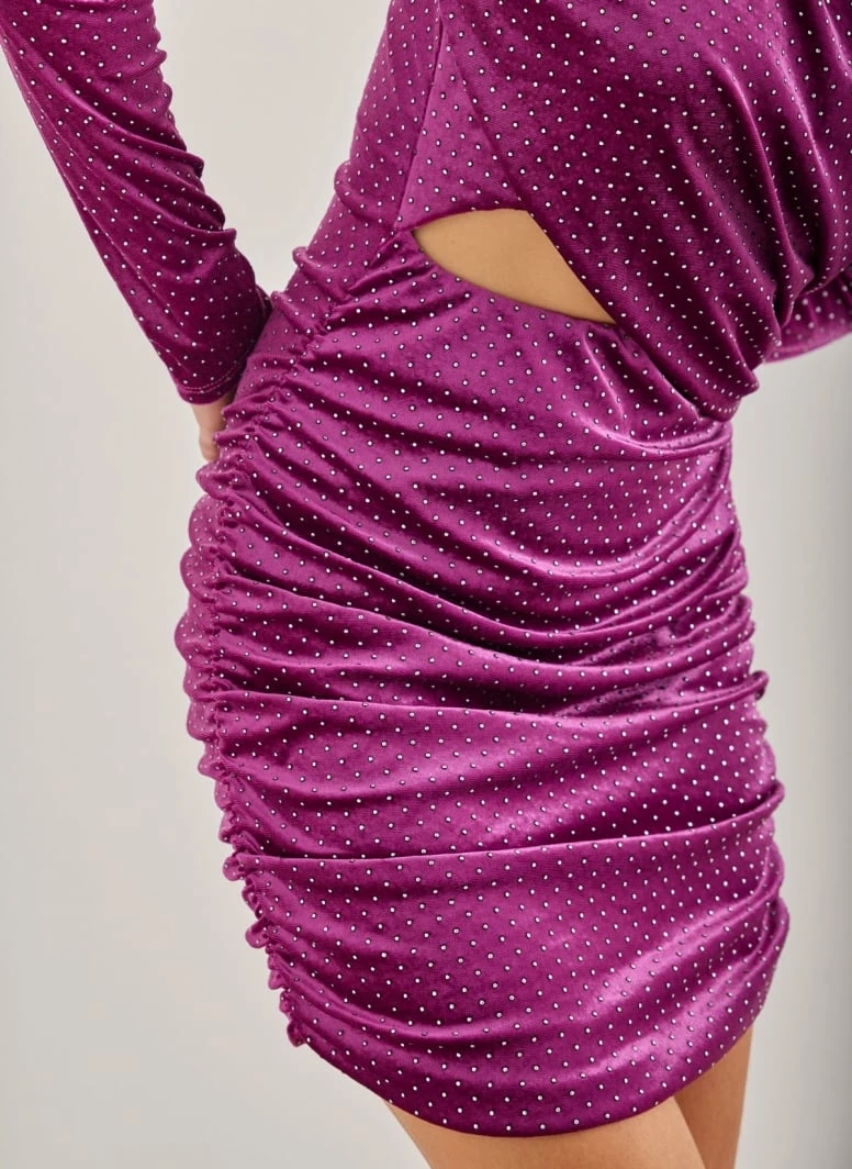 Μίνι φόρεμα με σούρες. Έχει βάτες και άνοιγμα στη μέση. Είναι βελουτέ με τρουκς.