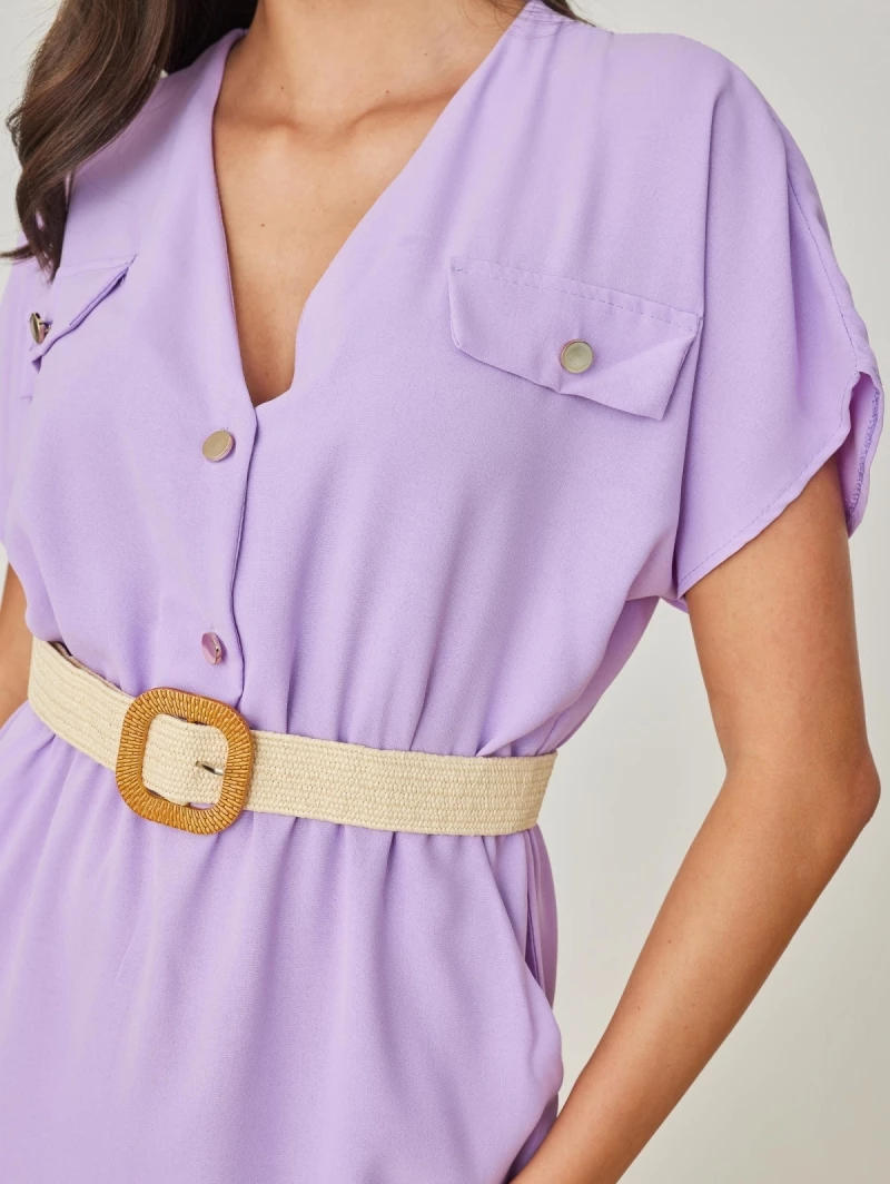 Φόρεμα μίντι με εφέ τσεπάκια στο μπούστο. Έχει v cut λαιμόκοψη και τσέπες στο πλάι. Περιλαμβάνεται πλεκτή ελαστική ζώνη με τετράγωνη αγκράφα. Made in Italy.