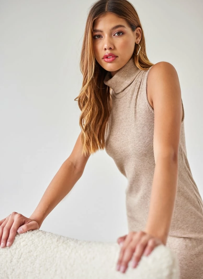 Φόρεμα casual αμάνικο με ριπ ύφανση. Έχει μίντι μάκρος και ζιβάγκο λαιμόκοψη. Ίσια γραμμή. Ελληνικής ραφής.