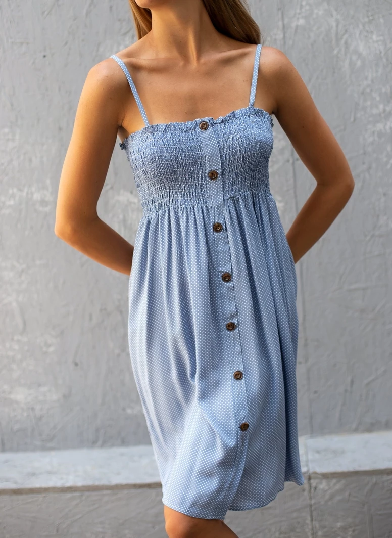 Πουά φορεματάκι με εφέ κουμπάκια. Έχει ρυθμιζόμενα ραντάκια και κάνει σφηκοφωλιά στο στήθος.