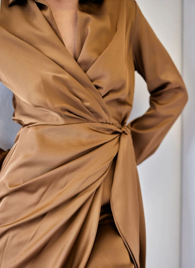 Φόρεμα μίνι σατέν με γιακά. Δένει με φαρδιά κορδέλα στο πλάι. Κρουαζέ μπούστο με σούρες. Μακριά μανίκια με μανσέτα.