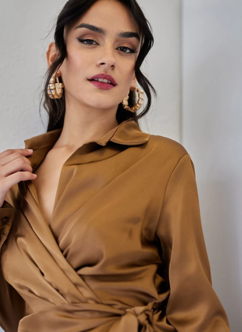 Ολοκαίνουργιο 🔔 The Fashion Project Φόρεμα σατέν με γιακά – Caramel 🔔