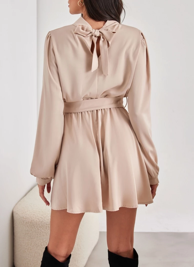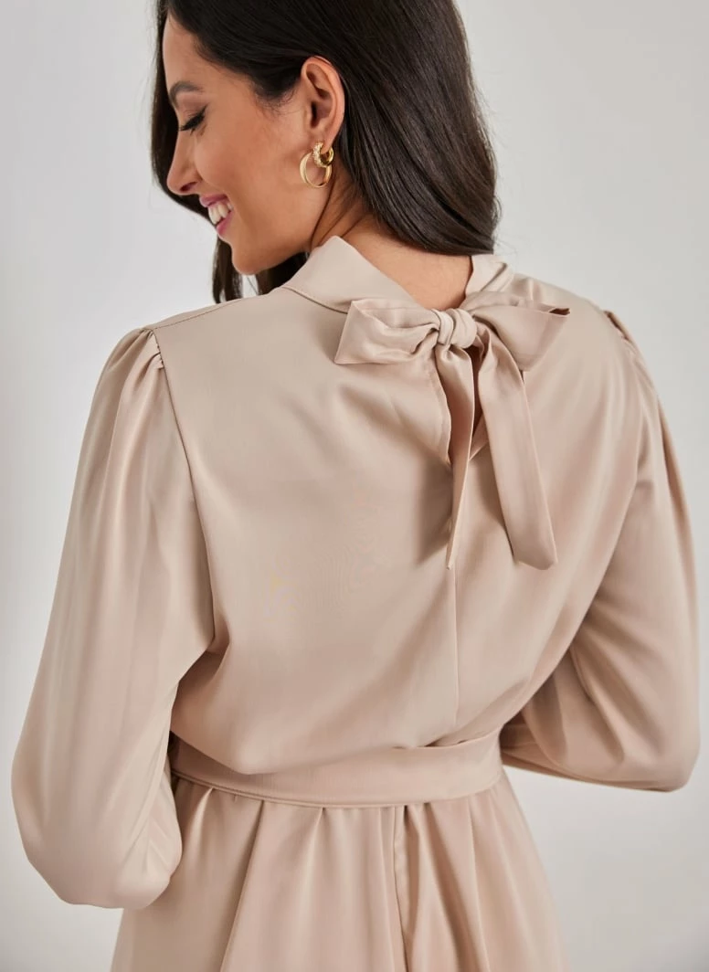 Φόρεμα σατέν με ψηλή λαιμόκοψη. Έχει άνοιγμα με κορδέλα στο πίσω μέρος. Λάστιχο στη μέση. Περιλαμβάνεται δετή υφασμάτινη ζώνη στο ίδιο χρώμα. Made in Italy.