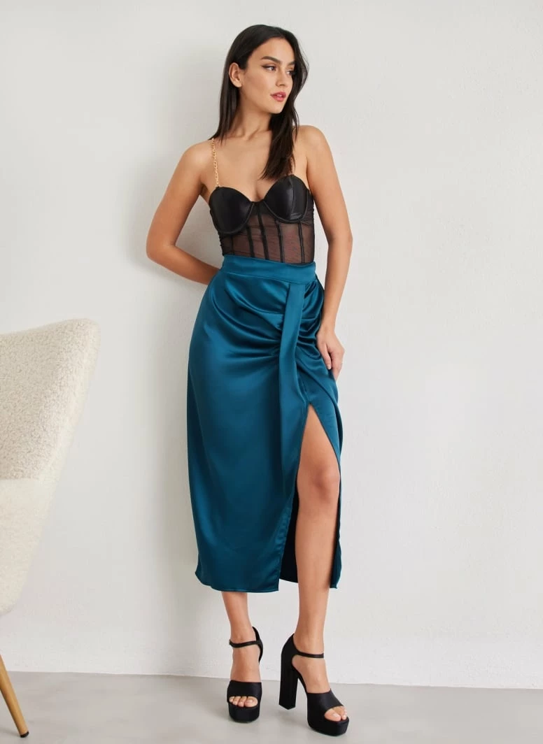 Flash Sale 🥰 The Fashion Project Φούστα μίντι σατέν με άνοιγμα – Petrol 🎉