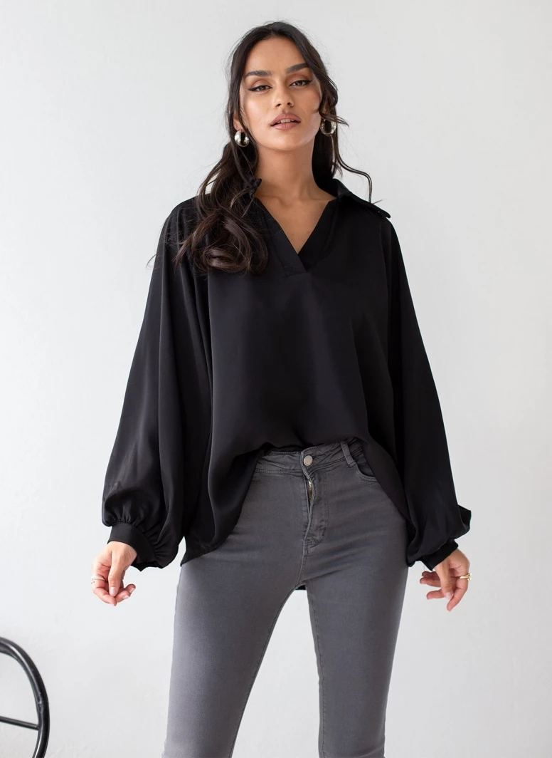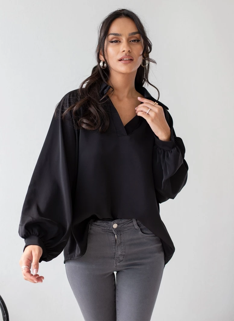Μπλούζα με v cut άνοιγμα και γιακά. Έχει λεπτή μανσέτα στα μανίκια. Άνετη γραμμή.