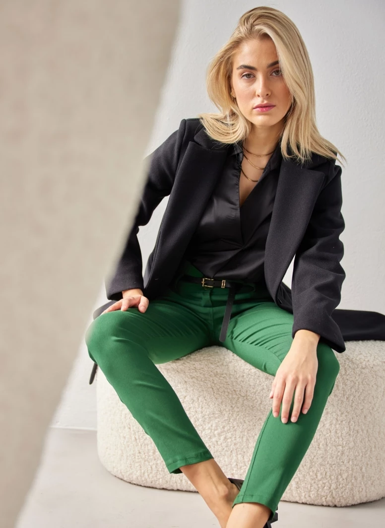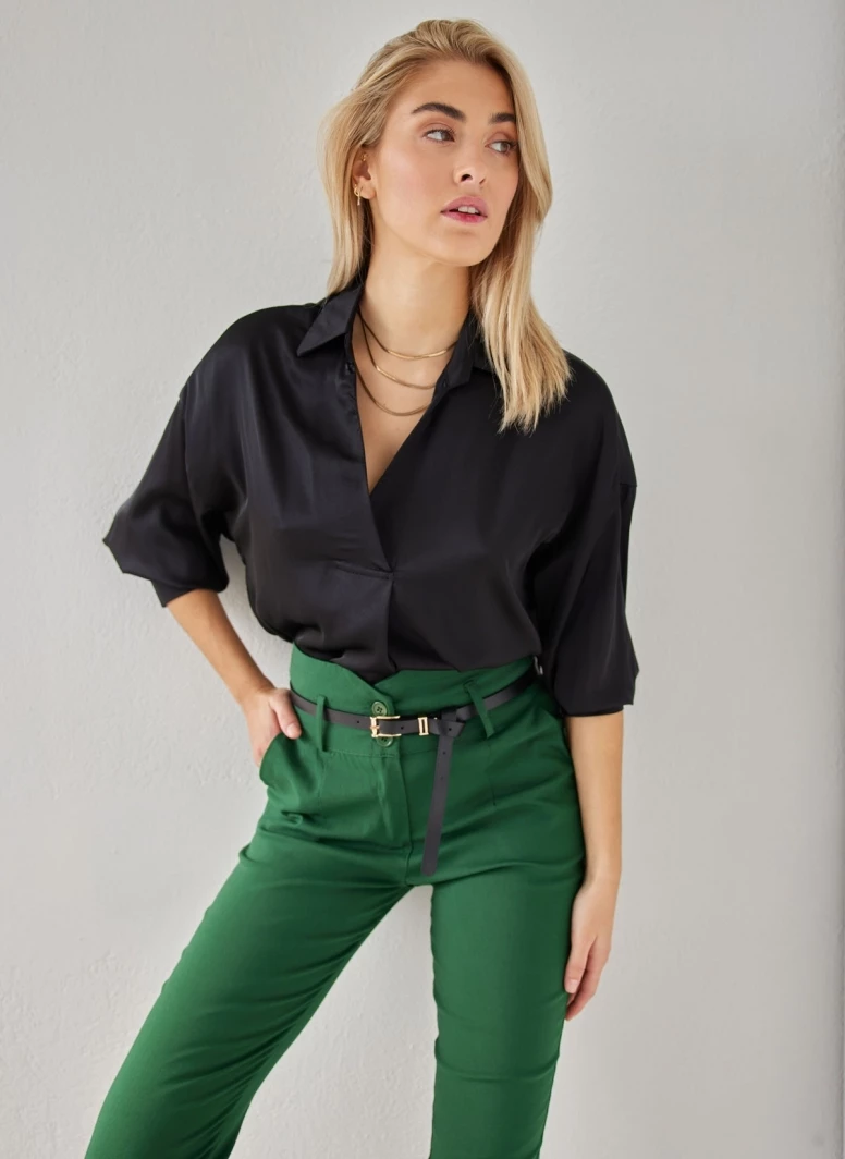 Μπλούζα σατέν με v cut άνοιγμα. Έχει κρουαζέ σχέδιο και γιακά. Φαρδιές μανσέτες με ένα κουμπί. Άνετη γραμμή. Made in Italy.