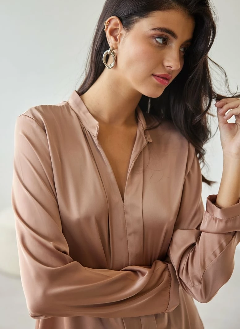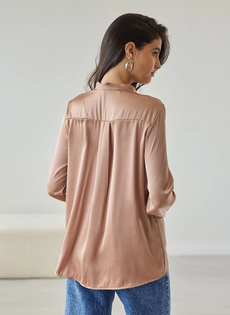 Μπλούζα σατέν με μάο γιακά. Έχει πιέτα στην πλάτη. Ίσια γραμμή.