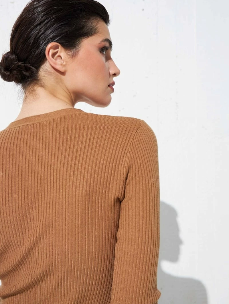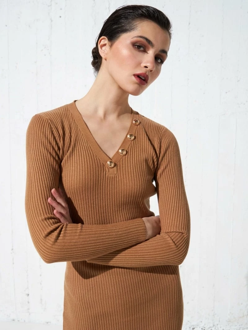 Πλεκτό εφαρμοστό φόρεμα με ριμπ πλέξη. Έχει V cut λαιμόκοψη και χρυσά κουμπιά.