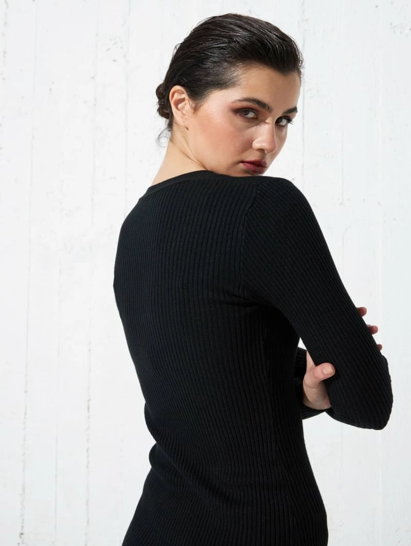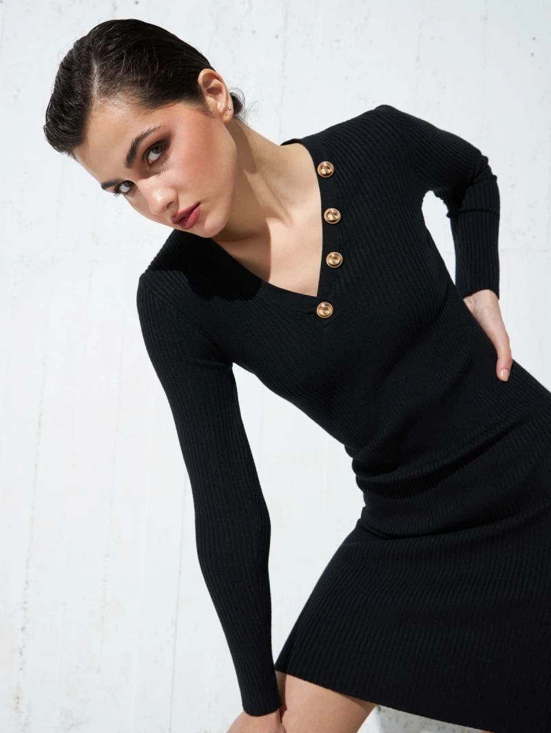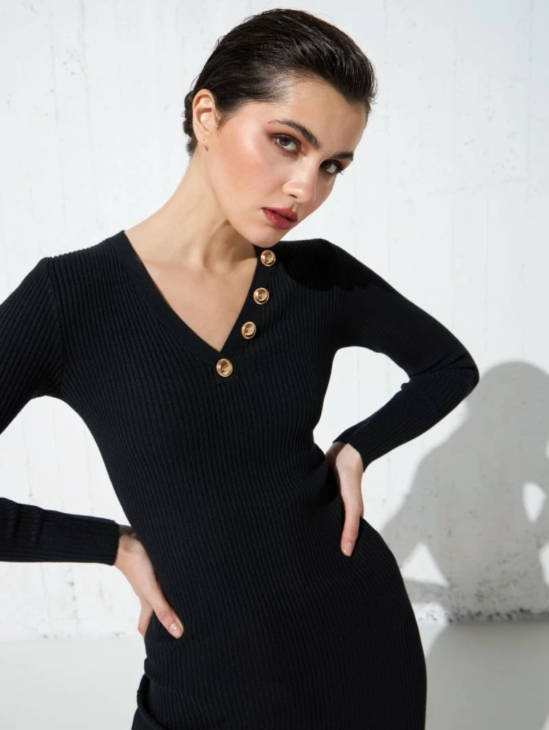 Πλεκτό εφαρμοστό φόρεμα με ριμπ πλέξη. Έχει V cut λαιμόκοψη και χρυσά κουμπιά.