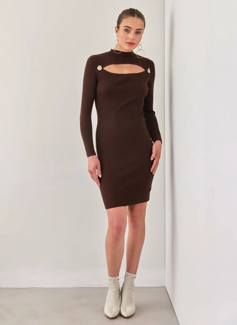 Φόρεμα μίντι με ριμπ πλέξη. Έχει cut out στο μπούστο με μεταλλικά κουμπιά. Ψηλή λαιμόκοψη. Εφαρμοστή γραμμή.