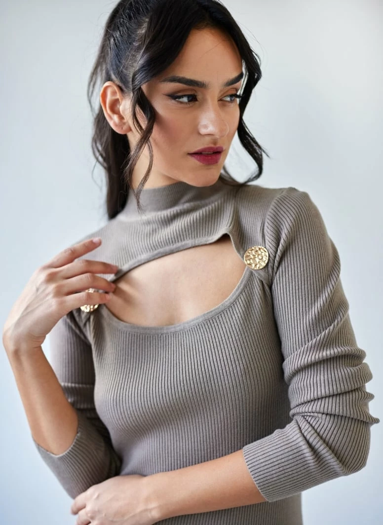 Φόρεμα μίντι με ριμπ πλέξη. Έχει cut out στο μπούστο με μεταλλικά κουμπιά. Ψηλή λαιμόκοψη. Εφαρμοστή γραμμή.