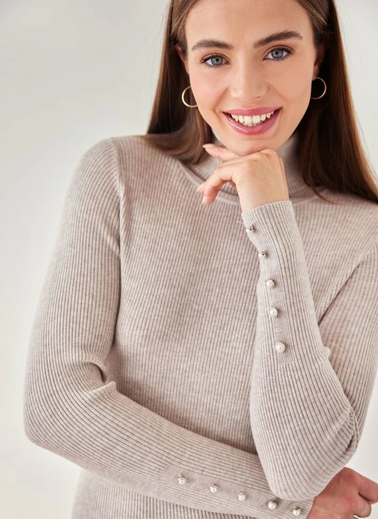 Προώθηση 👍 The Fashion Project Πλεκτό φόρεμα με κουμπιά πέρλες – Μπεζ ⭐