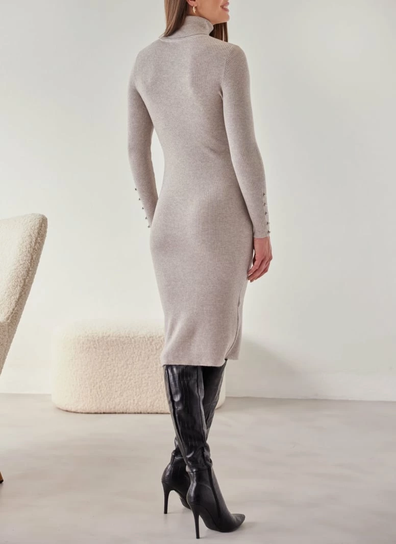 Φόρεμα πλεκτό ζιβάγκο με ριμπ πλέξη. Έχει κουμπιά πέρλες στα μανίκια. Μίντι μάκρος. Εφαρμοστή γραμμή.