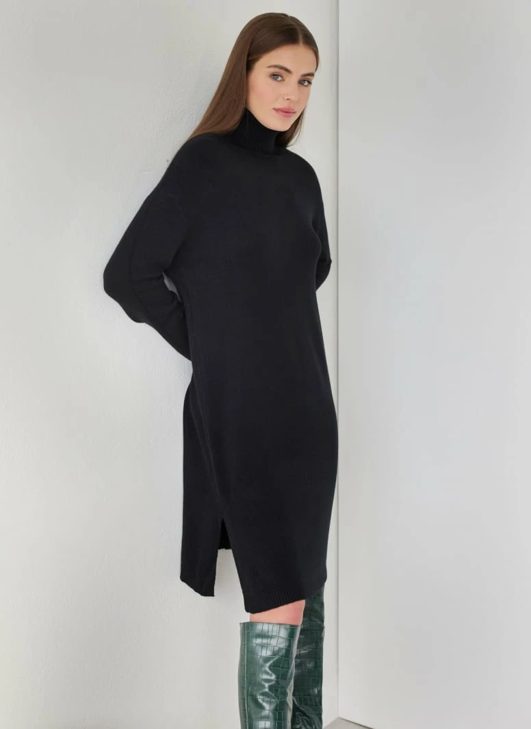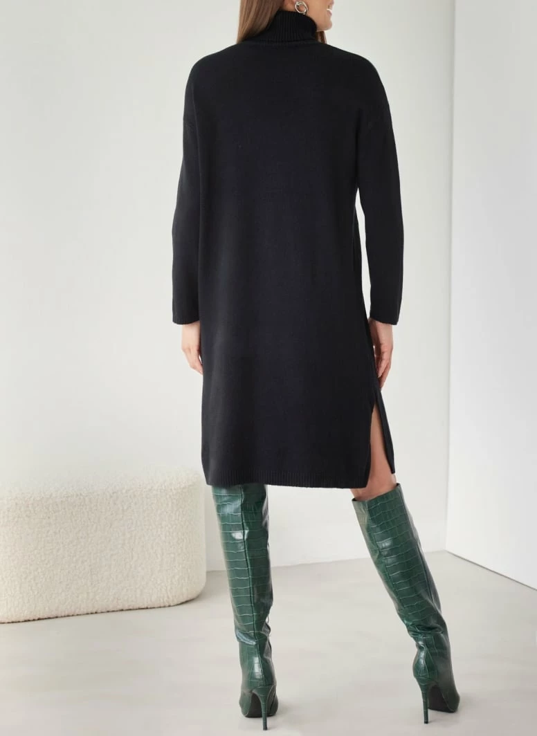 Φόρεμα μίντι πλεκτό. Έχει ζιβάγκο λαιμόκοψη. Σχέδιο κουμπιά στα μανίκια. Ρίγες στην πλέξη στο τελείωμα. Μικρά ανοίγματα στο πλάι. Άνετη γραμμή.
