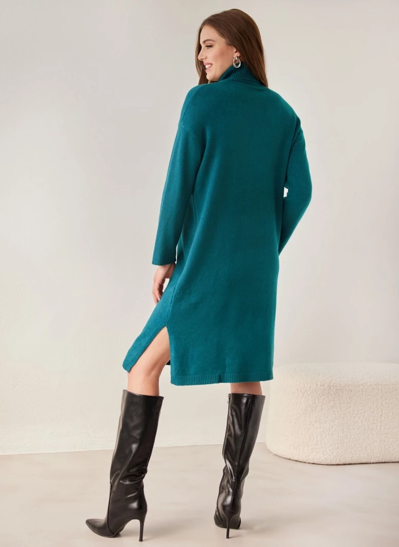 Φόρεμα μίντι πλεκτό. Έχει ζιβάγκο λαιμόκοψη. Σχέδιο κουμπιά στα μανίκια. Ρίγες στην πλέξη στο τελείωμα. Μικρά ανοίγματα στο πλάι. Άνετη γραμμή.