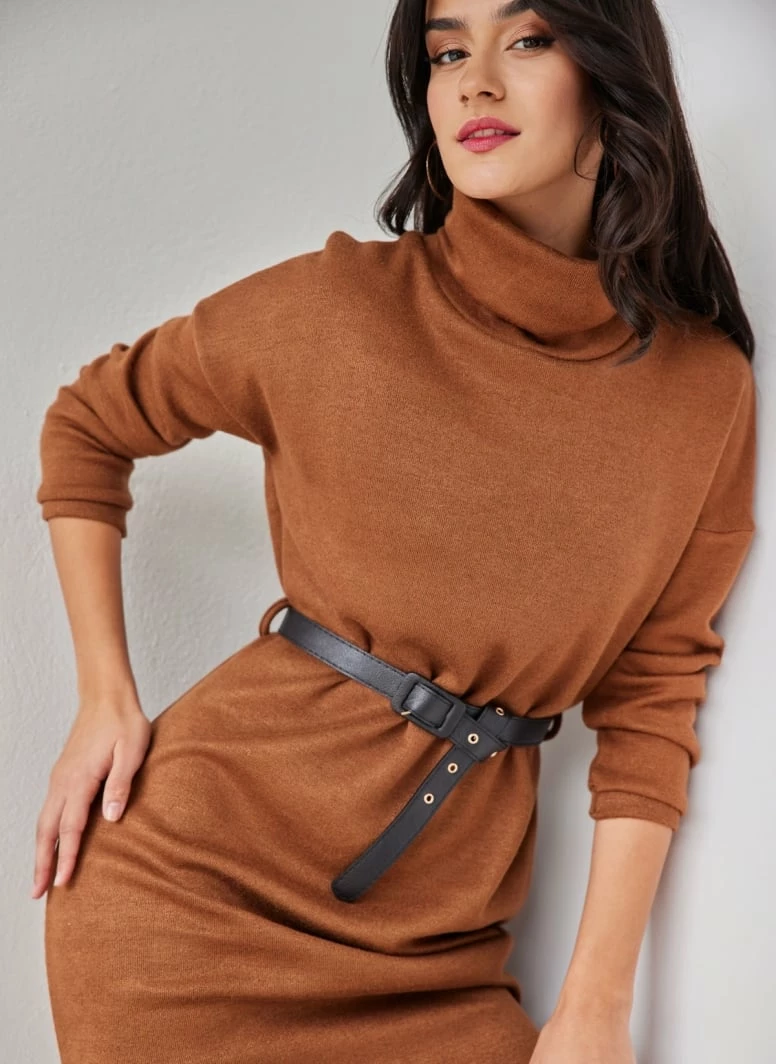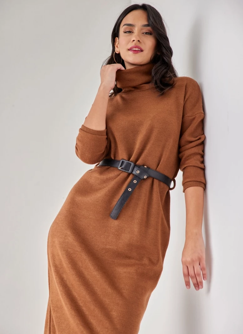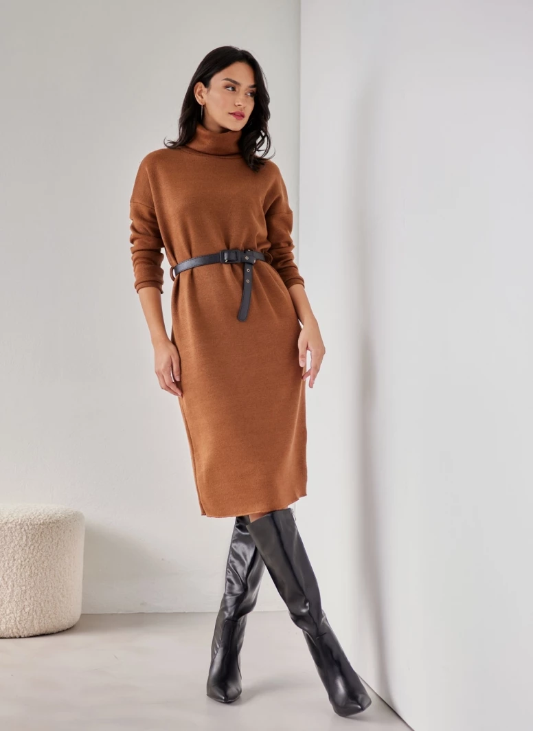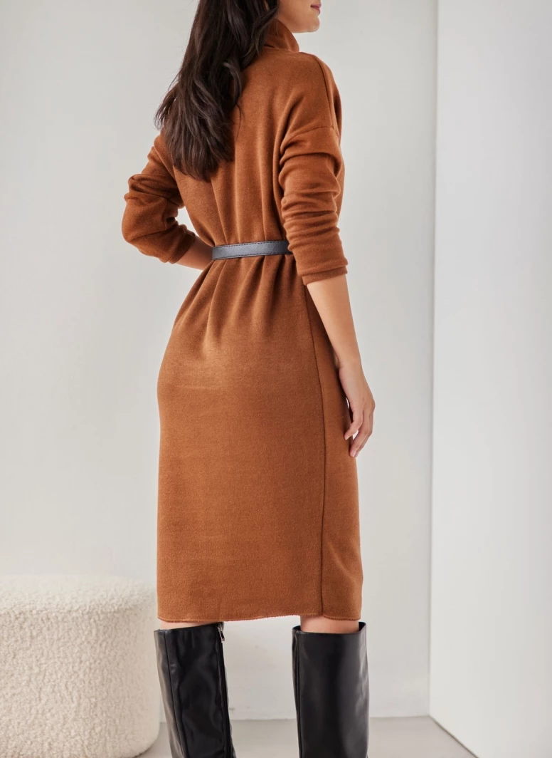 Φόρεμα πλεκτό μίντι. Έχει ζιβάγκο λαιμόκοψη. Ίσια γραμμή. Περιλαμβάνεται ζωνάκι δερματίνη.