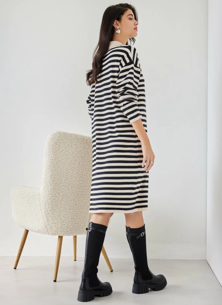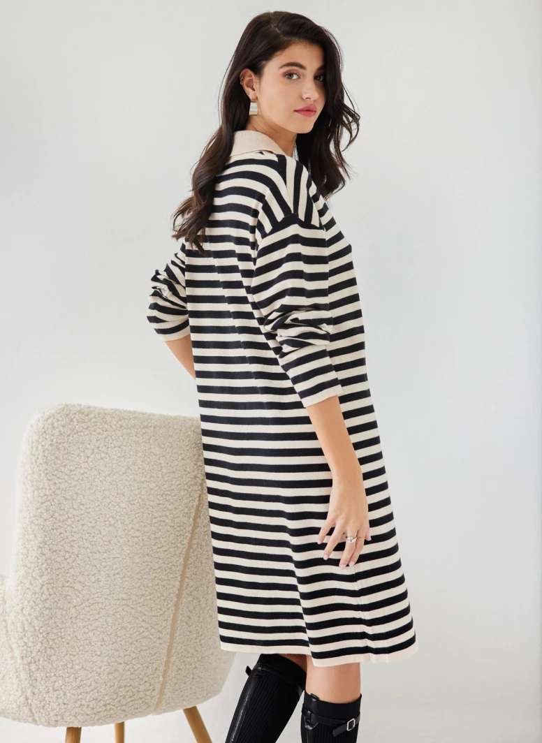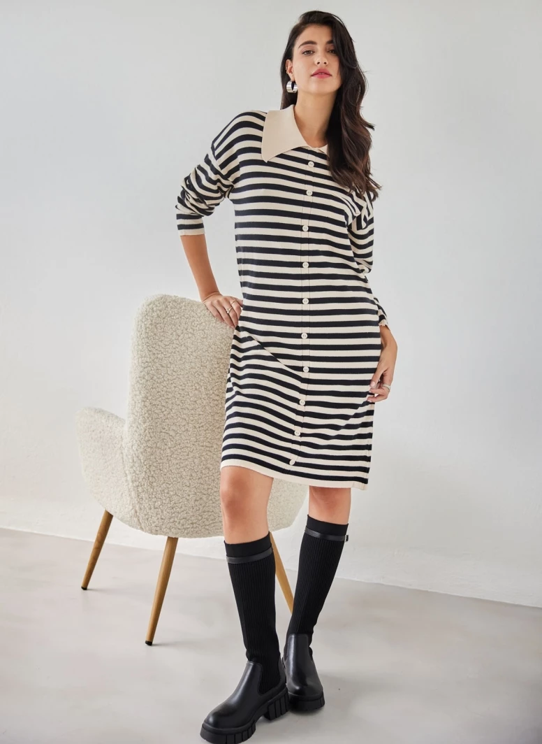 Πλεκτό φόρεμα ριγέ με εφέ κουμπιά. Έχει γιακά στη λαιμόκοψη. Ίσια άνετη γραμμή.