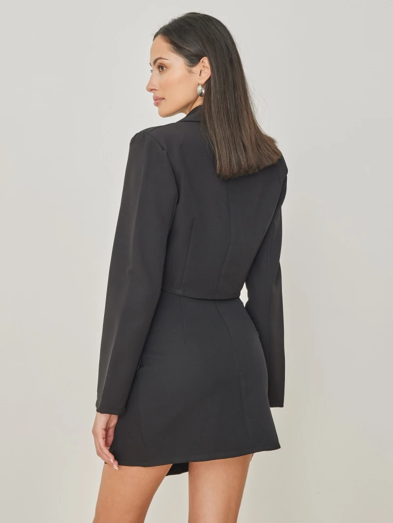 Σετ φούστα με σακάκι.Η φούστα είναι μίνι με εφέ τσέπες και σκίσιμο στο πλάι.Το σακάκι έχει cropped γραμμή.Κλείνει με μεταλλικό κουμπί.Made in Italy.
