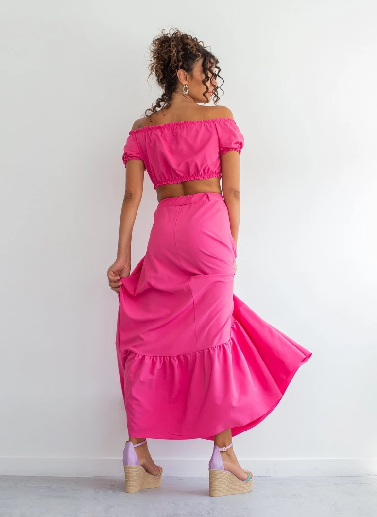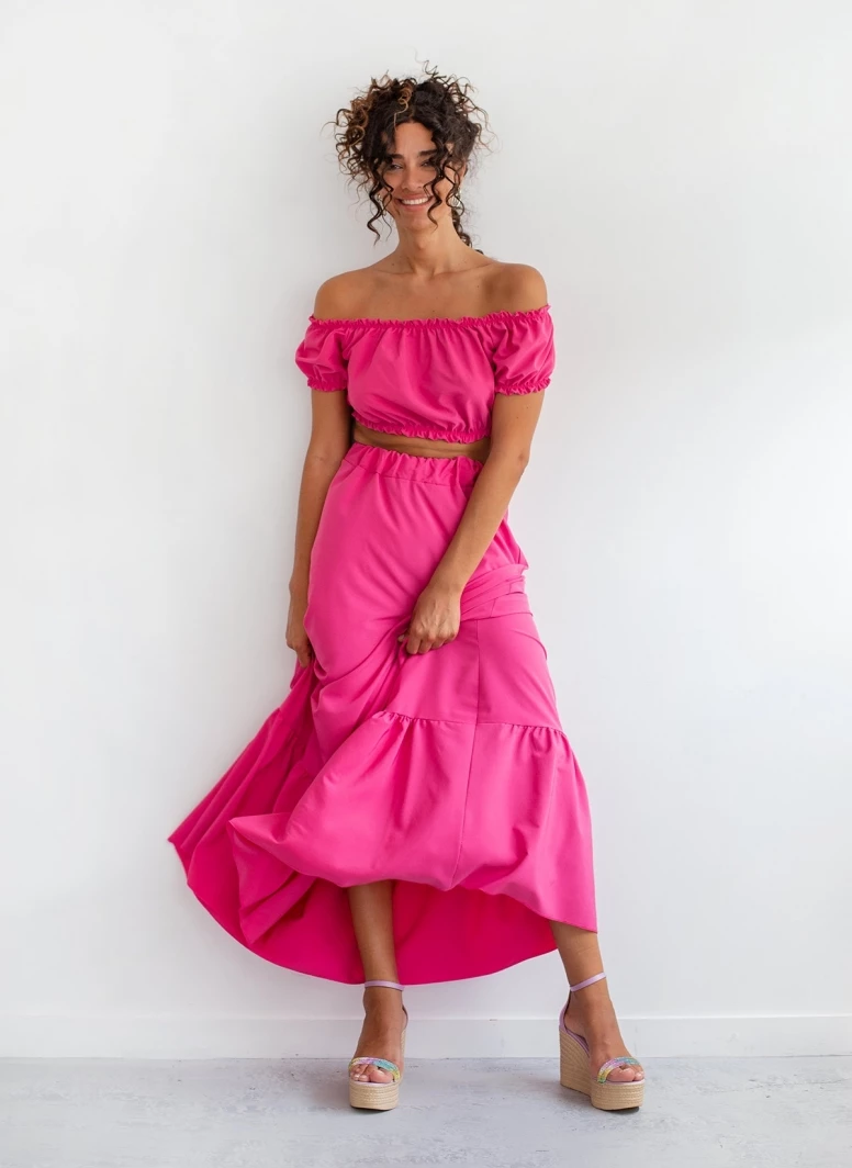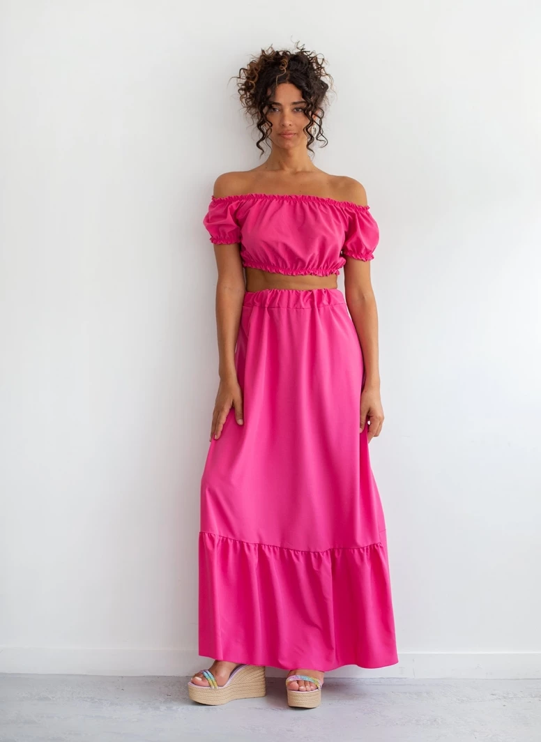 Σετ ρούχων. Το τοπ έχει cropped γραμμή και λάστιχο στα μανίκια και το τελείωμα. Η φούστα είναι maxi με βολάν στο τελείωμα. Έχει λάστιχο στη μέση. Made in Italy.
