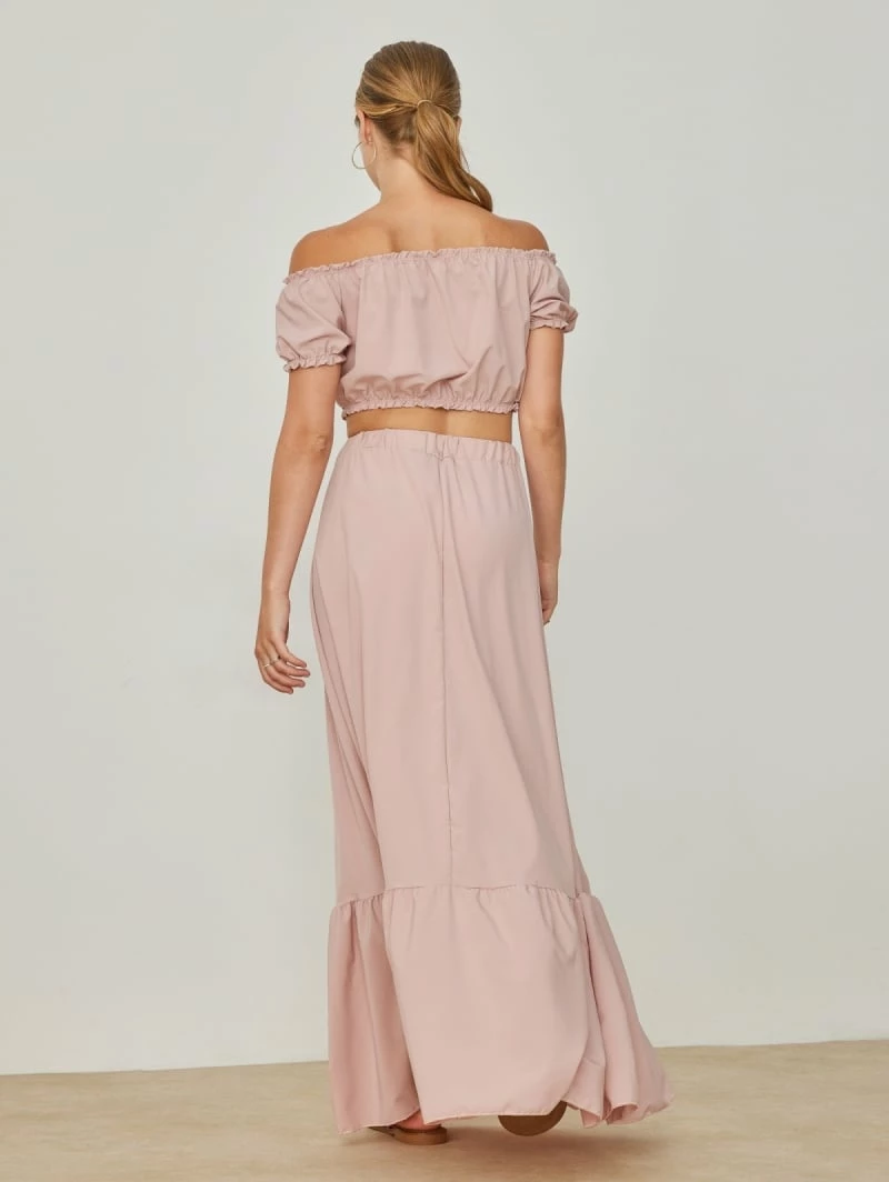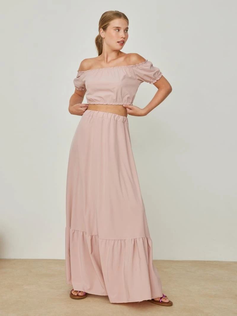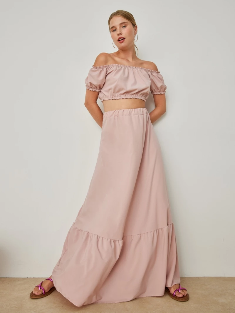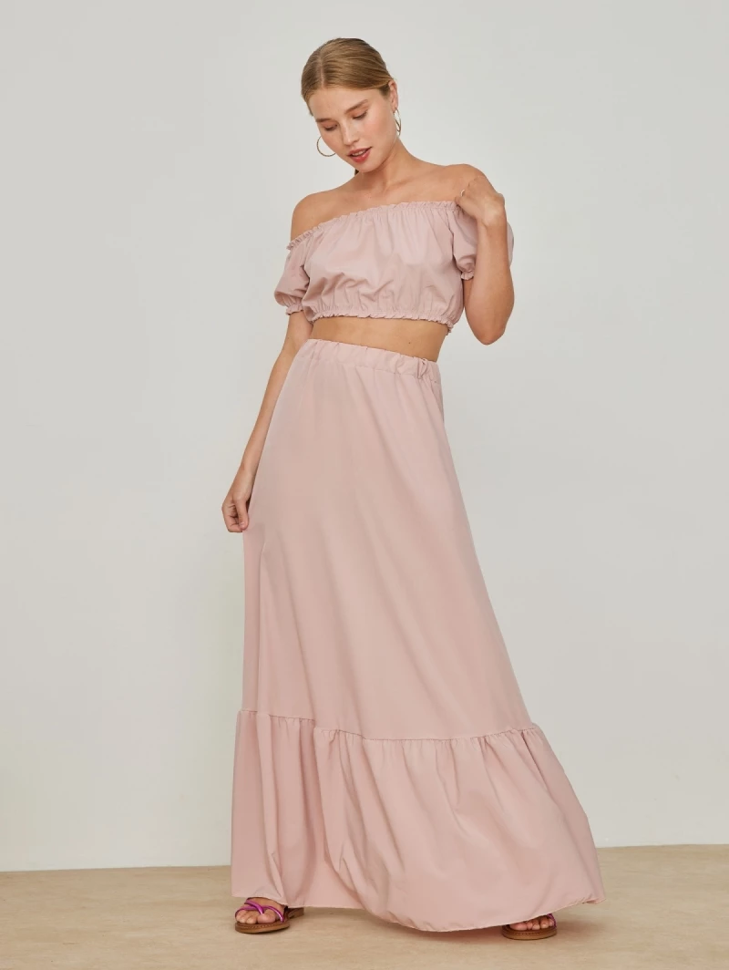Σετ ρούχων. Το τοπ έχει cropped γραμμή και λάστιχο στα μανίκια και το τελείωμα. Η φούστα είναι maxi με βολάν στο τελείωμα. Έχει λάστιχο στη μέση. Made in Italy.
